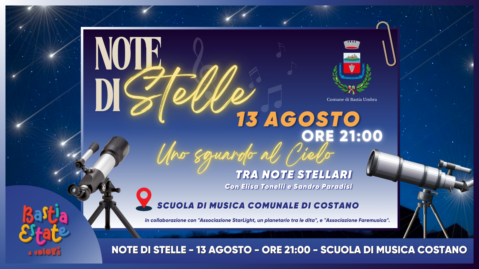 Anche questo anno torna l’apprezzatissimo “Note di Stelle” il 13 Agosto alle ore 21:00 presso lo spazio esterno della Scuola di Musica di Costano.