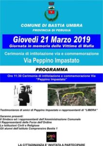 21 Marzo – “Giornata in Memoria delle Vittime di Mafia”. A Bastia Umbra – Cerimonia di intitolazione di una via a “Peppino Impastato”.