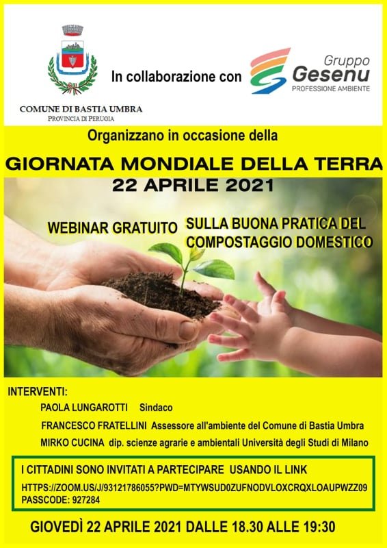 Comune di Bastia Umbra in collaborazione con GEST/Gesenu in occasione della Giornata Mondiale della Terra 2021 hanno il piacere di invitarvi a partecipare al Webinar Gratuito sulla buona pratica del compostaggio domestico.