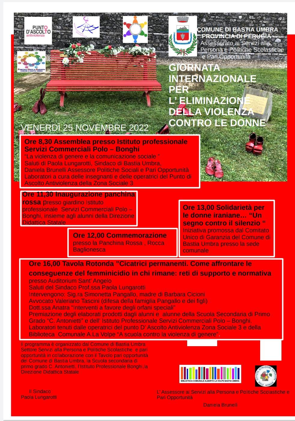 Il programma è organizzato dal Comune di Bastia Umbra, Settore Servizi alla persona, Scuole e Pari Opportunità in collaborazione con il Tavolo delle Pari Opportunità comunale, la scuola secondaria di I grado C.Antonietti dell’Ist.Comprensivo Bastia 1, l’Ist. Prof. Marco Polo -Bonghi, la Direzione Didattica Statale di Bastia Umbra, Rav, Punto d’ascolto, CUG.
