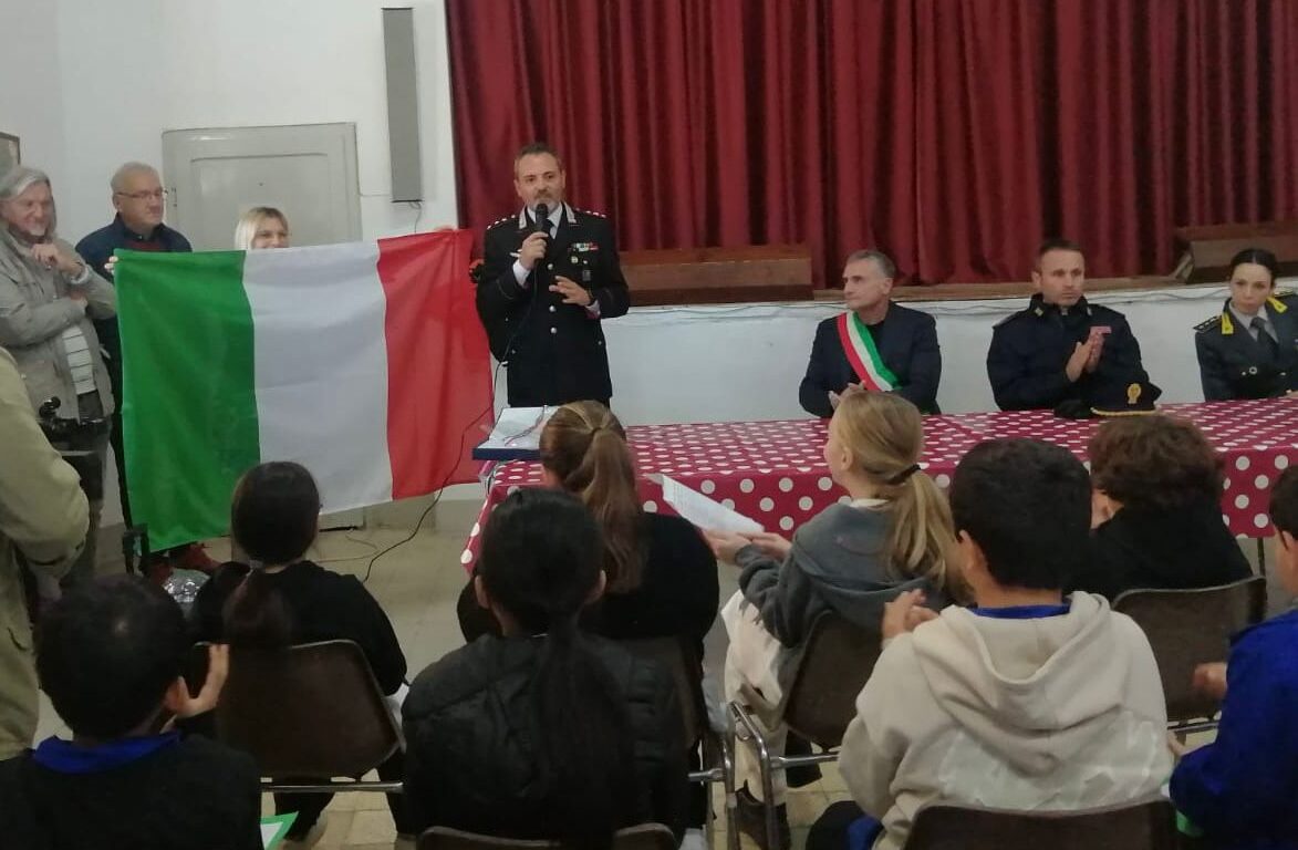 Il comandante della Compagnia, Capitano Massimiliano Croce, alla presenza dei soci dell’Associazione Nazionali Mutilati e Invalidi di Guerra e Associazione Nazionale Carabinieri – “Sez. Col. Valerio Gildoni M.O.V.M. alla Memoria”, intitolata all’Ufficiale, originario del posto, perito tragicamente in servizio in Bosco di Nanto (VI), il 17 luglio 2009, ha infine consegnato all’istituto scolastico la bandiera tricolore, quale simbolo dei valori dell’Unità Nazionale.