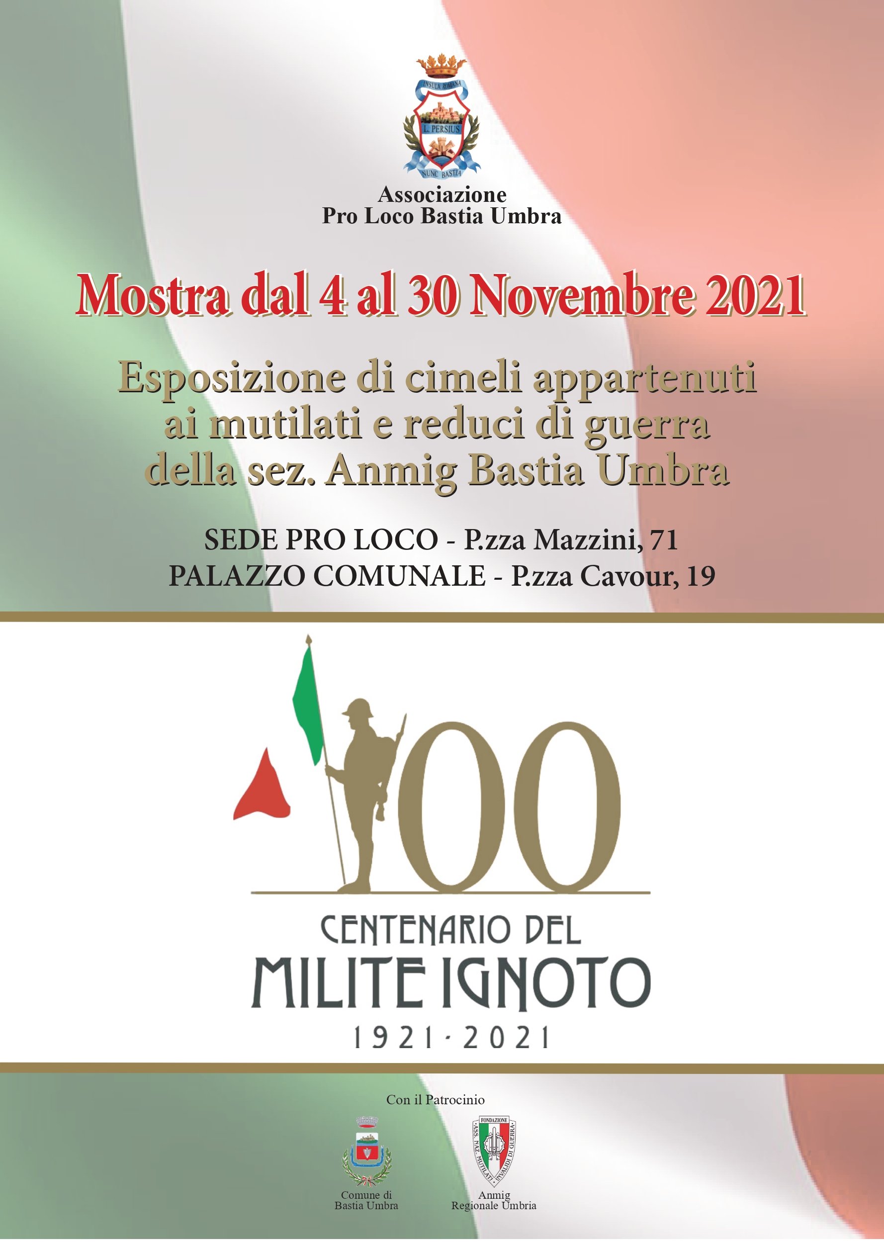 Inoltre, dal 4 al 30 Novembre una mostra di quadri, fotografie e cimeli sarà allestita presso la sede della Ass. ne Pro Loco in piazza Mazzini e nel Municipio, (Piazza Cavour, 19), a testimonianza e ricordo. Con autorizzazione di ANMIG nel Centenario del Milite Ignoto saranno esposti i cimeli della cessata Sez. ANMIG di Bastia, conservati dalla Ass. Pro Loco in osservanza alla finalità statutaria di salvaguardare le memorie cittadine per preservarle e valorizzarle. Tutte le manifestazioni si svolgeranno nel rispetto delle misure di sicurezza previste dalla normativa anti Covid-19.