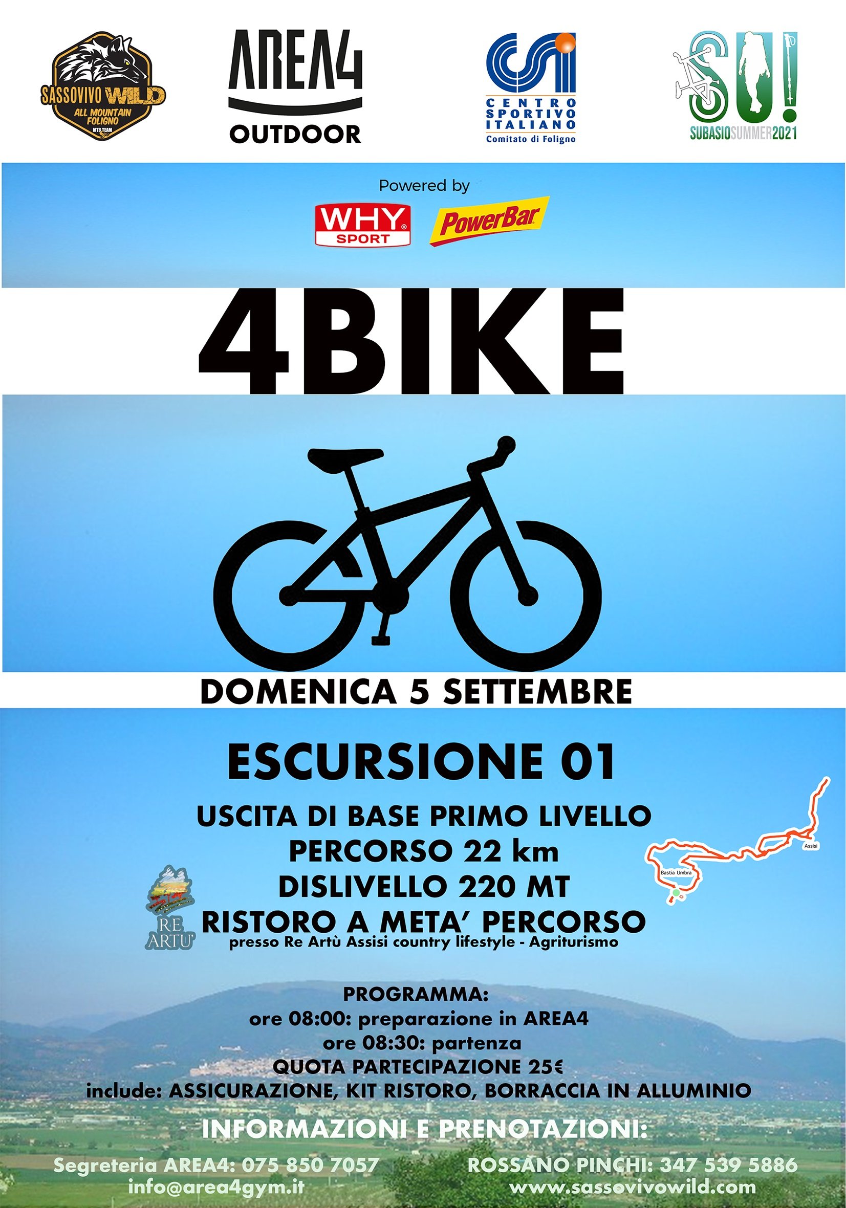 Per questa prima iniziativa dal titolo ‘4Bike’, la palestra Area4 si avvale della collaborazione di All Mountain Foligno, società dilettantistica legata al Centro Sportivo Italiano come ente di appartenenza.