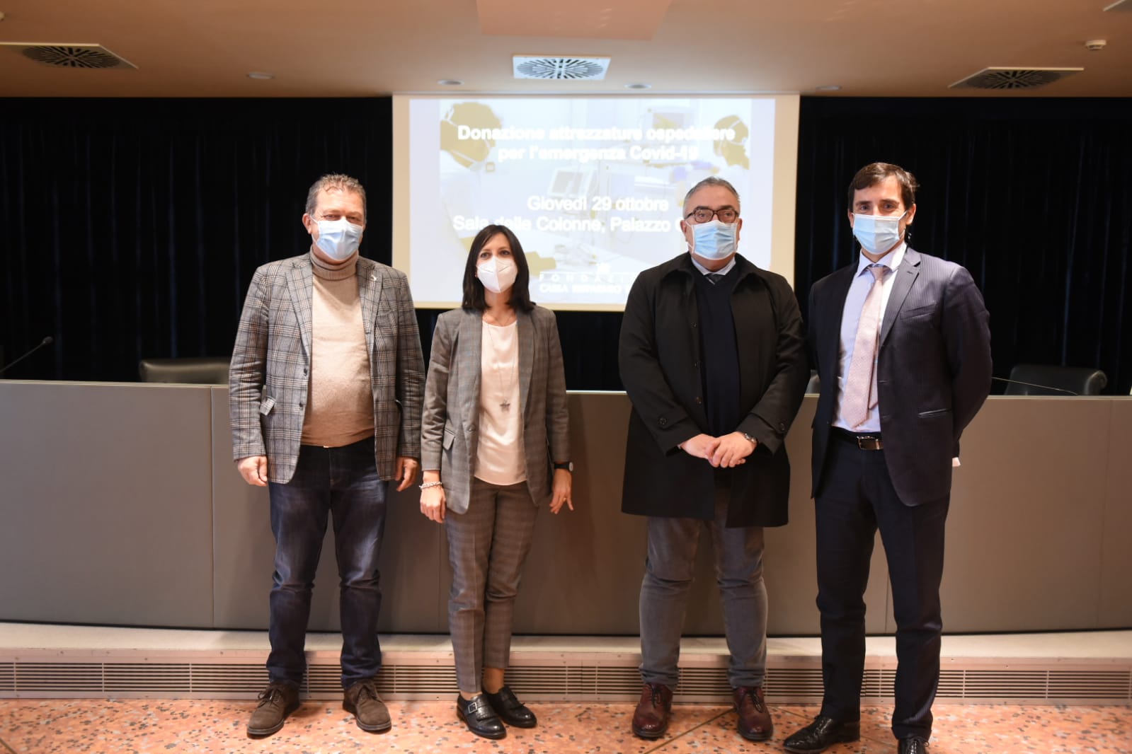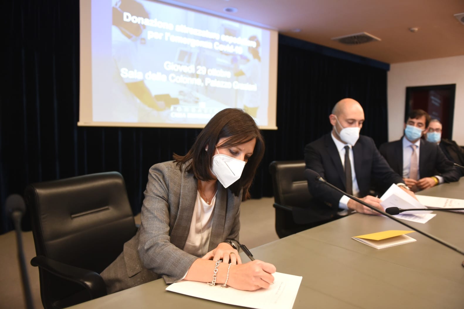 Questa mattina, nel massimo rispetto delle norme di sicurezza anti Covid-19, presso la sede della Fondazione il Presidente Cristina Colaiacovo, il Commissario straordinario dell’Azienda Ospedaliera di Perugia, Marcello Giannico e il Commissario straordinario della Ausl 1 Gilberto Gentili, alla presenza dell’Assessore regionale alla Sanità Luca Coletto hanno sottoscritto l’atto notarile con il quale si formalizza la donazione delle attrezzature che, già collocate nei vari nosocomi, sono state di fondamentale aiuto a medici ed operatori sanitari per fornire una risposta di cura tempestiva ed adeguata ai pazienti ricoverai affetti dal virus.