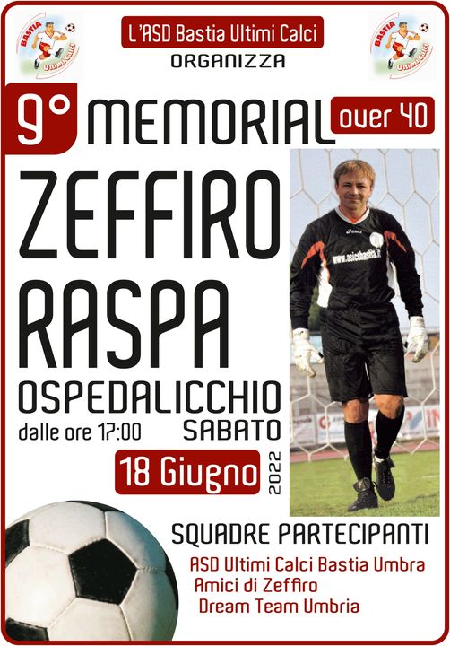 Reduci dal secondo posto conquistato nel Torneo di Aosta over 50, sconfitti immeritatamente in finale dall’Arzignano (VC) l’ A.S.D. Ultimi Calci Bastia Umbra organizza il 9° Memorial Zeffiro Raspa.Si svolgerà sabato 18 giugno, a partire dalle ore 17, presso il campo sportivo di Ospedalicchio.
