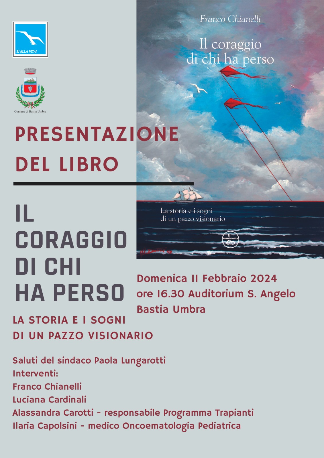 Verrà presentato a Bastia Umbra nella bella cornice dell’Auditorium Sant’Angelo “Il coraggio di chi ha perso. La storia e i sogni di un pazzo visionario” di Franco Chianelli, presidente e fondatore del Comitato per la vita “Daniele Chianelli”, associazione per la cura, la ricerca contro leucemie, linfomi, mielomi e tumori infantili.