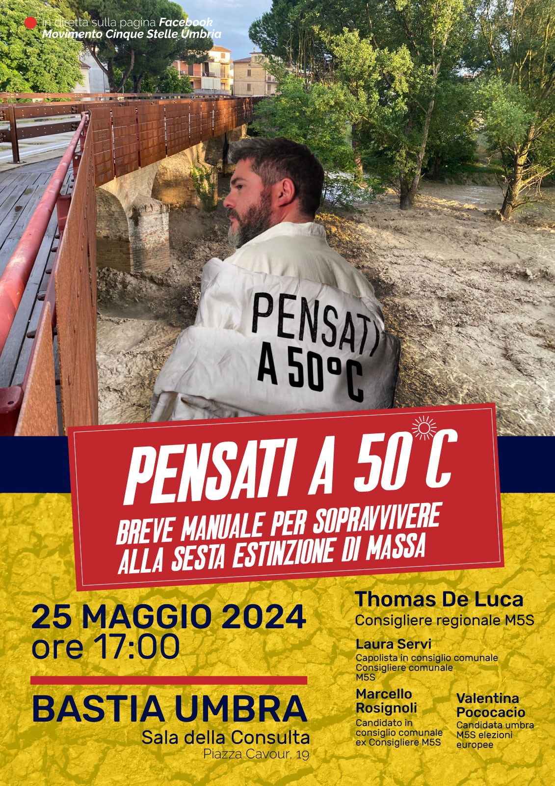 “Pensati a 50 gradi: breve manuale per sopravvivere alla sesta estinzione di massa”. E’ il titolo dell’evento promosso dal consigliere regionale del Movimento 5 Stelle Thomas De Luca in programma sabato 25 maggio a Bastia Umbra, nella sala della Consulta del Comune in Piazza Cavour dalle ore 17. Saranno presenti anche i candidati consiglieri Laura Servi e Marcello Rosignoli e la candidata del M5S alle elezioni europee Valentina Pococacio.