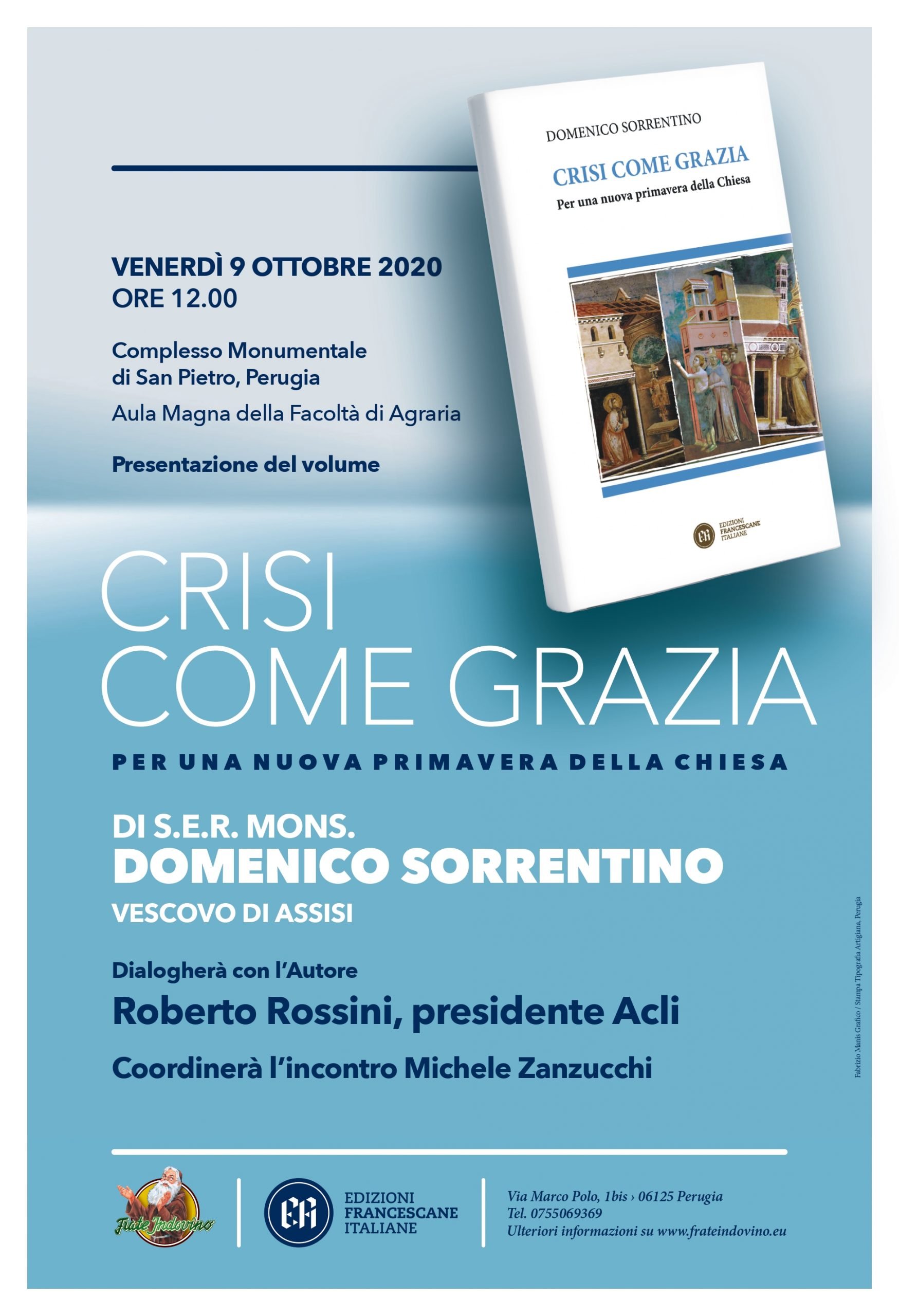 ASSISI – Sarà presentato venerdì 9 ottobre alle ore 12, nell’ambito dell’evento Umbria Libri, nell’Aula Magna della Facoltà di Agraria (Borgo XX Giugno n. 74) a Perugia, l’ultimo libro “Crisi come grazia. Per una nuova primavera della Chiesa” del vescovo della diocesi di Assisi – Nocera Umbra – Gualdo Tadino, monsignor Domenico Sorrentino. All’incontro, coordinato dal giornalista Michele Zanzucchi, interviene Roberto Rossini, presidente nazionale delle Acli che dialogherà con l’autore. Il libro è pubblicato da Edizioni francescane italiane.