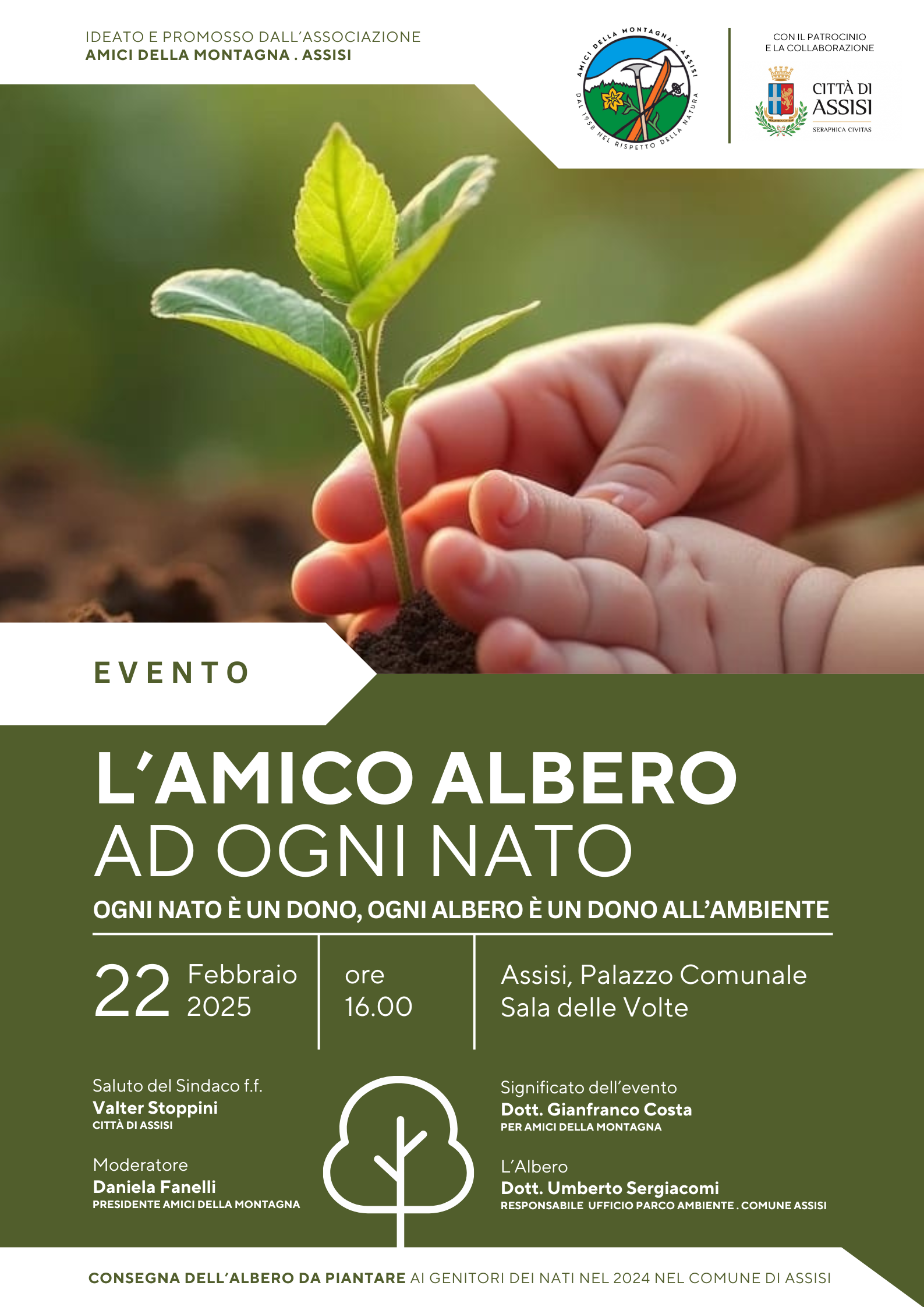 L’iniziativa è ideata e promossa dall’associazione Amici della Montagna di Assisi, con il patrocinio e la collaborazione del Comune di Assisi. Sabato 22 febbraio 2025, alle ore 16, nella Sala delle Volte del Palazzo comunale, si terrà un incontro pubblico per presentare l’idea e consegnare gli alberi alle famiglie che hanno accolto l’invito.