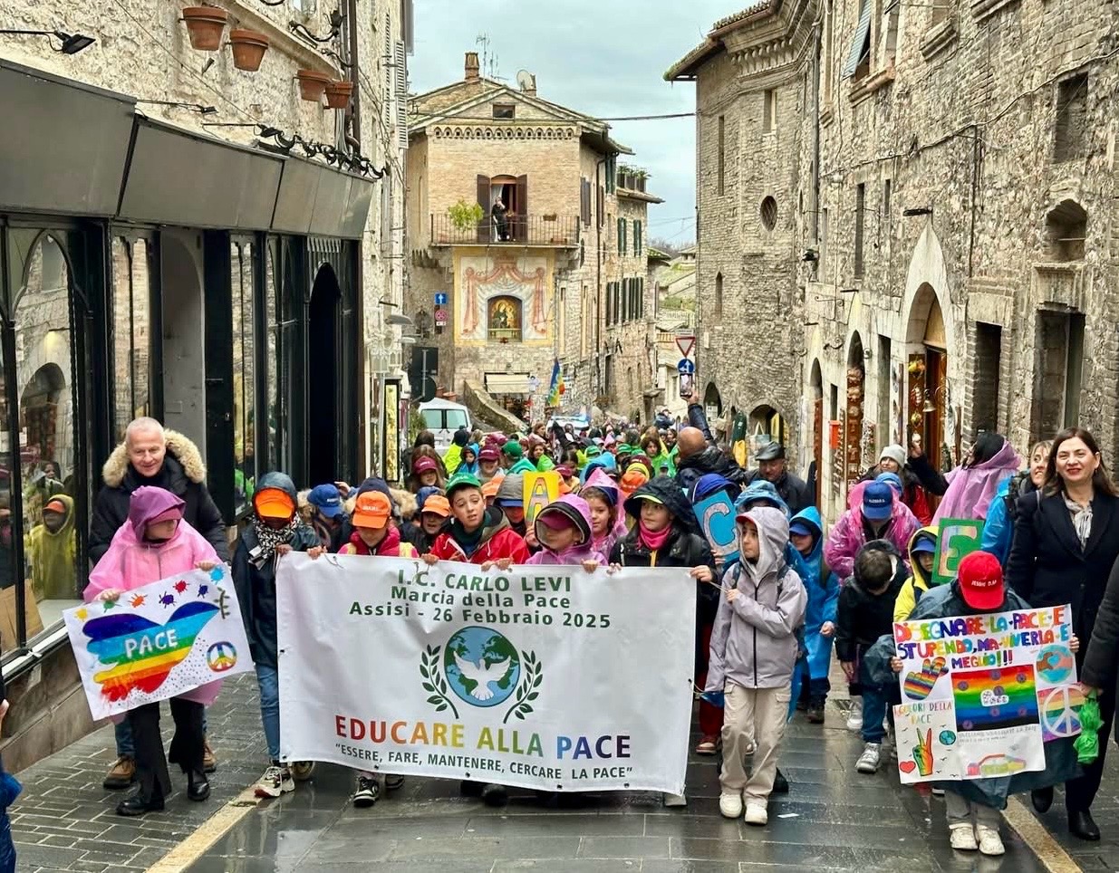 La piccola marcia della pace si svolta da piazza Giovanni Paolo II alla piazza inferiore della Basilica di San Francesco, dove i trecento studenti hanno dato vita alla parola “Pace” disponendosi in modo tale da renderla leggibile dall’alto. Da qui hanno poi lanciato il grido “La pace si può” e fatto festa con canti e disegni legati al tema. All’evento è intervenuto anche fra Raphael Normanno, coordinatore della Basilica di San Francesco.