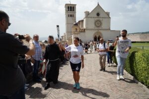 A dare il saluto per primo è stato il sindaco di Assisi Stefania Proietti che, dopo aver ringraziato gli organizzatori per aver deciso di regalare la tappa ad Assisi, ha spiegato perché l’amministrazione ha scelto di accogliere la Fiaccola sotto il Tempio di Minerva: “E’ un luogo simbolo della nostra città, davanti alla chiesa e di fronte al palazzo comunale, il Tempio è un luogo rappresentato anche da Giotto che ha raccontato magistralmente attraverso i suoi dipinti la vita di San Francesco e da qui il legame con il nostro Santo”. Il primo cittadino ha sottolineato “l’importanza dello sport con i suoi valori come fattore di coesione sociale e manifestazioni come queste vanno nella direzione dello sport verso i giovani e invogliano i giovani verso lo sport” e ha ricordato il vincolo che unisce Assisi e Napoli perché la regione Campania lo scorso 4 ottobre ha acceso la lampada votiva davanti alla tomba di San Francesco.