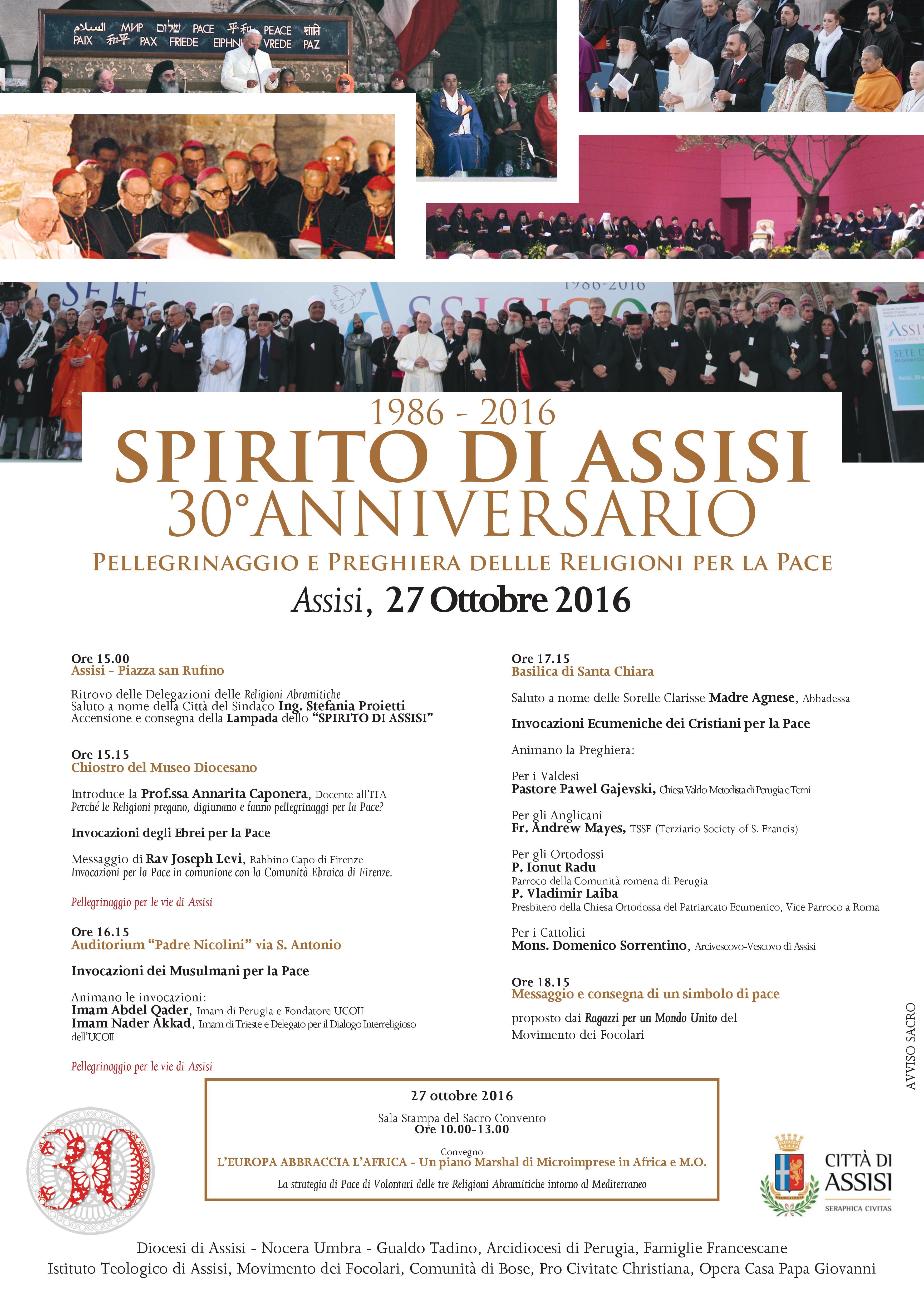 Dopo la straordinaria rievocazione vissuta a settembre con la Comunità di Sant’Egidio, la la commissione diocesana per lo “Spirito di Assisi” di cui fanno parte diversi enti ha organizzato una giornata celebrativa con i rappresentanti delle religioni abramitiche (cristiani, ebrei e musulmani) che si ritroveranno giovedì 27 ottobre per pregare per la pace, nel giorno effettivo dell’anniversario dello storico incontro. Come da programma in mattinata dalle 10 alle 13 nella sala stampa del Sacro Convento si terrà il convegno sul tema: “L’Europa abbraccia l’Africa. Un piano Marshall di microimprese in Africa e Medio Oriente. La strategia di pace di volontari delle tre religioni abramitiche intorno al Mediterraneo”, organizzato dall’associazione Civiltà dell’Amore.