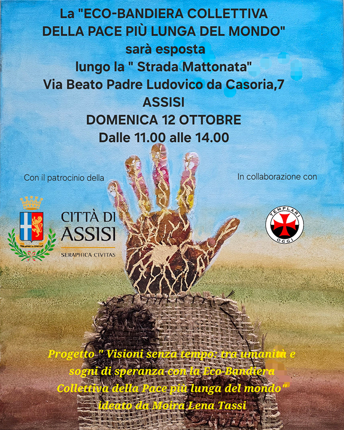 Il grande drappo colorato verrà dispiegato da volontari dell’associazione Templari Oggi, a partire dall’altezza dell’Istituto Teologico di Assisi. Fa parte del progetto “Visioni senza tempo: tra umanità e sogni di speranza con la Eco-Bandiera Collettiva della Pace più lunga del mondo”, ideato più di un anno fa da Moira Lena Tassi presso l’Open Air Museum Italo Bolano di Portoferraio, trovando domenica prossima ad Assisi una collocazione ideale.