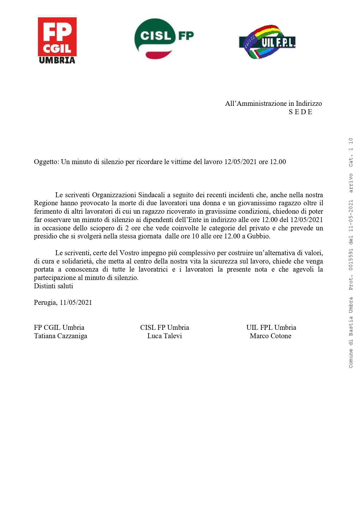 Oggetto : POSTA CERTIFICATA: Un minuto di silenzio per ricordare le vittime del lavoro 12/05/2021 ore 12.00