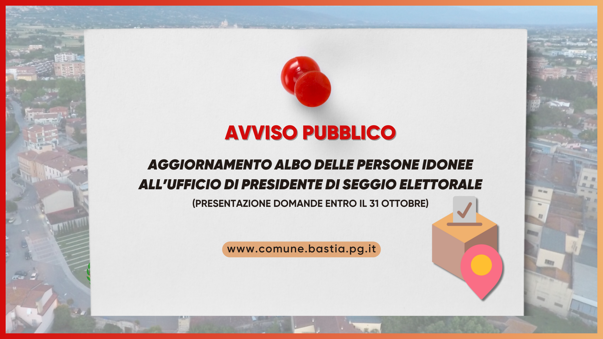 Si comunica a tutti gli elettori ed elettrici del Comune di Bastia che è in corso d’aggiornamento l’Albo delle persone idonee all’ufficio di Presidente di seggio elettorale. Si invita pertanto a presentare domanda entro il 31 Ottobre 2024.