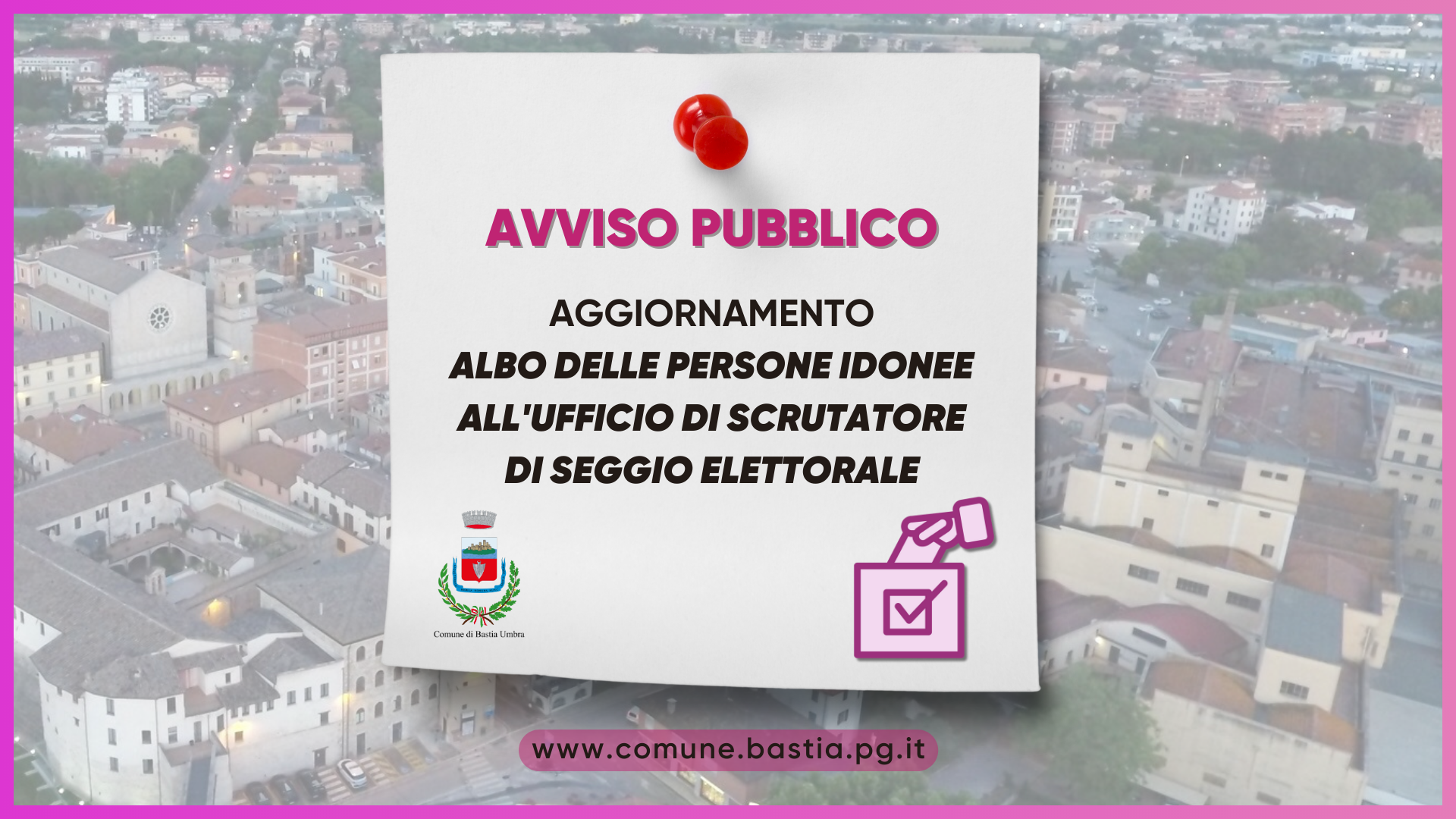 Bastia Umbra, 28 ottobre 2024 – Si invitano tutti gli elettori ed elettrici del Comune di Bastia Umbra, che desiderano essere inseriti nell’Albo delle persone idonee all’Ufficio di Scrutatore di Seggio Elettorale a presentare domanda entro il 30 novembre 2024.