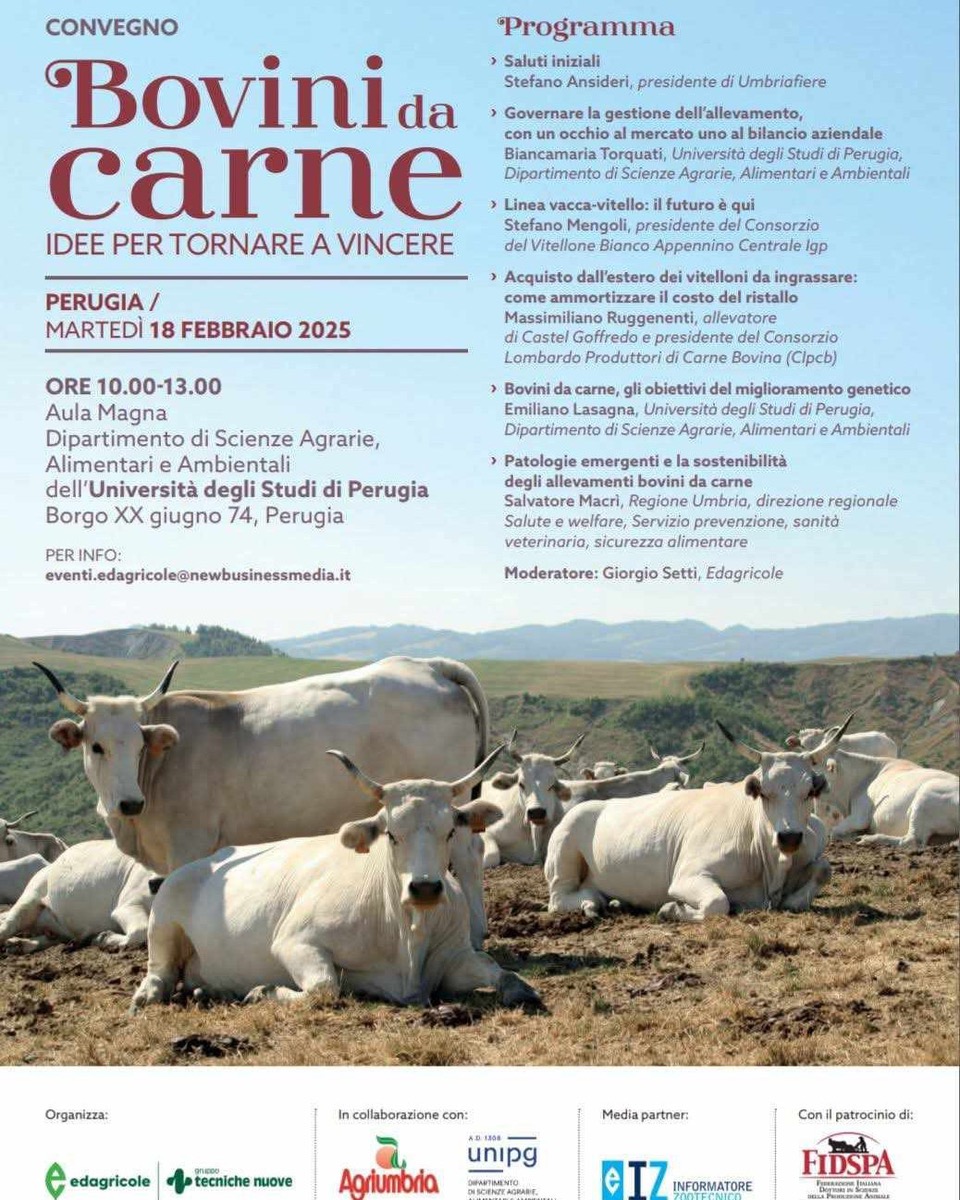 Ad inaugurare i lavori ci sarà Stefano Ansideri, presidente di Umbriafiere. Sono previsti gli interventi di Biancamaria Torquati, Università di Perugia, Dipartimento di Scienze agrarie alimentari e ambientali; Stefano Mengoli, presidente del Consorzio del Vitellone Bianco Appennino Centrale Igp; Massimiliano Ruggenenti, allevatore di Castel Goffredo e presidente del Consorzio Lombardo Produttori di Carne Bovina (Clpcb); Emiliano Lasagna, Università di Perugia, professore associato, Dipartimento di Scienze agrarie alimentari e ambientali; Salvatore Macrì, Regione Umbria, Direzione regionale Salute e welfare, Servizio prevenzione, sanità veterinaria, sicurezza alimentare. Coordina Giorgio Setti di Edagricole.