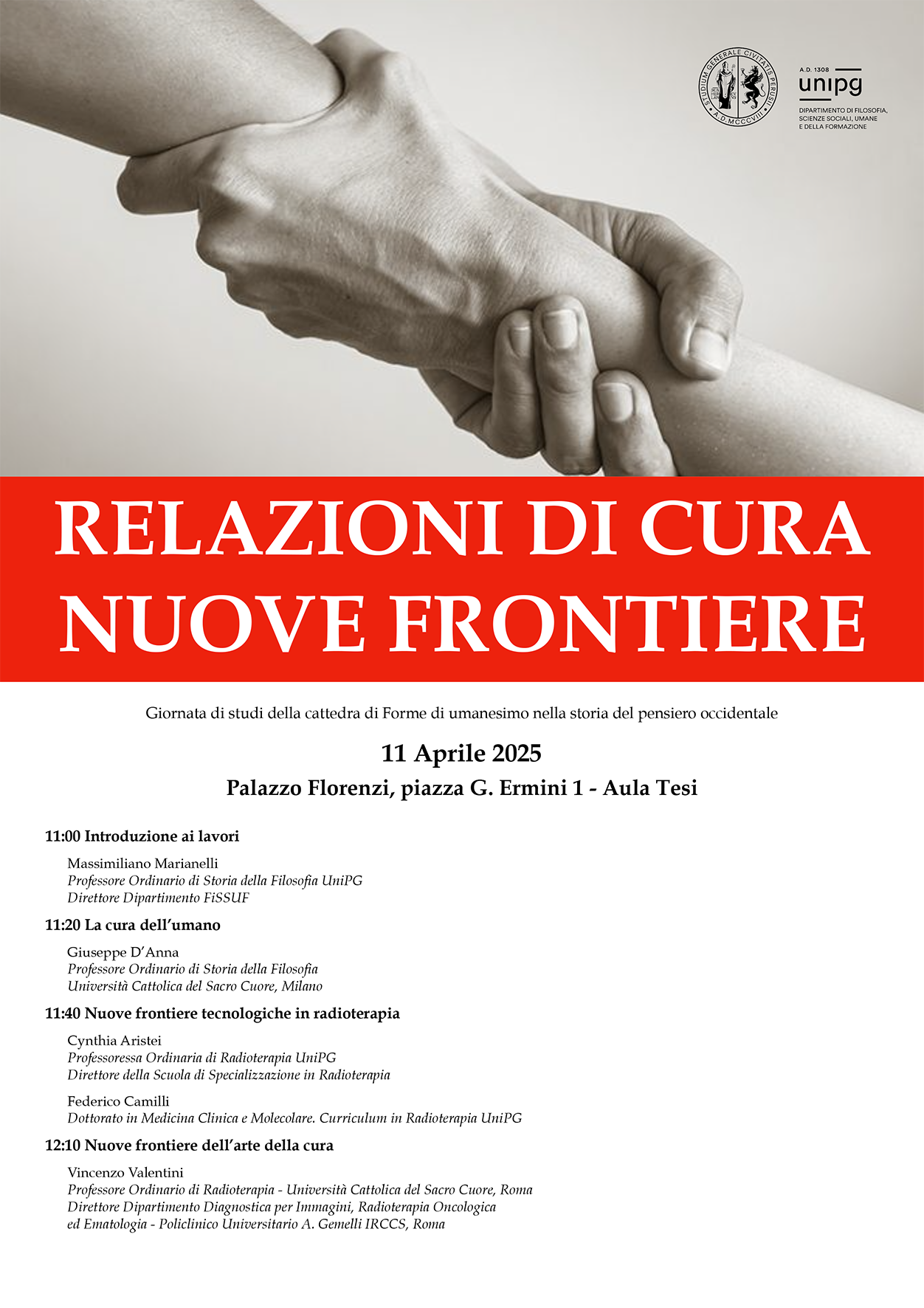 Perugia, 09/04/2025 – Relazioni di cura. Nuove frontiere: è questo il titolo – e il cuore pulsante – della giornata di studi che si terrà venerdì 11 aprile 2025 alle ore 11.00 presso l’Aula Tesi del Dipartimento di Filosofia, Scienze sociali, Umane e della Formazione (FISSUF) dell’Università degli Studi di Perugia.