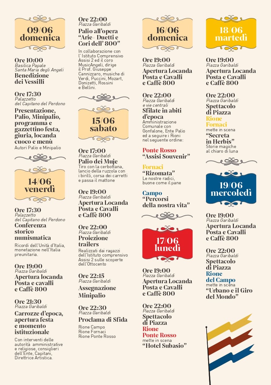 Sabato 15 iniziano i giochi e le sfide ufficiali, ma vi consigliamo di non perdervi venerdì 14, la conferenza storico numismatica, un interessante momento culturale dove si parlerà della monetazione nell’Italia preunitaria. A seguire, alle ore 21,00 in piazza Garibaldi, la sfilata delle carrozze d’epoca che faranno da preludio ai saluti istituzionali e al concerto “Arie e Cori dell’800”. Quest’ultimo grazie al supporto dell’Istituto Comprensivo Assisi 2 e al coro MusicAngeli, che eseguirà, sotto la direzione del professor Giuseppe Cannizzaro, brani iconici della musica classica ottocentesca, da Verdi a Puccini (di cui quest’anno ricorrono i 100 anni dalla sua morte), passando per Mozart e Donizzetti.