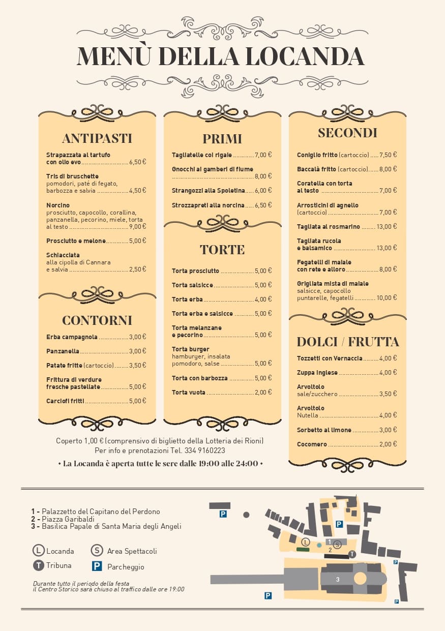 Fra le novità da non perdere è sicuramente la tanto attesa apertura della Locanda, quest’anno, completamente gestita da Ente e Rioni e da un Cuoco d’eccezione che, tutte le sere, delizierà il palato dei commensali con un menù composto da prelibatezze del territorio e sfiziosità che sarà possibile gustare comodamente seduti o perché no anche da asporto, in attesa che comincino gli spettacoli.