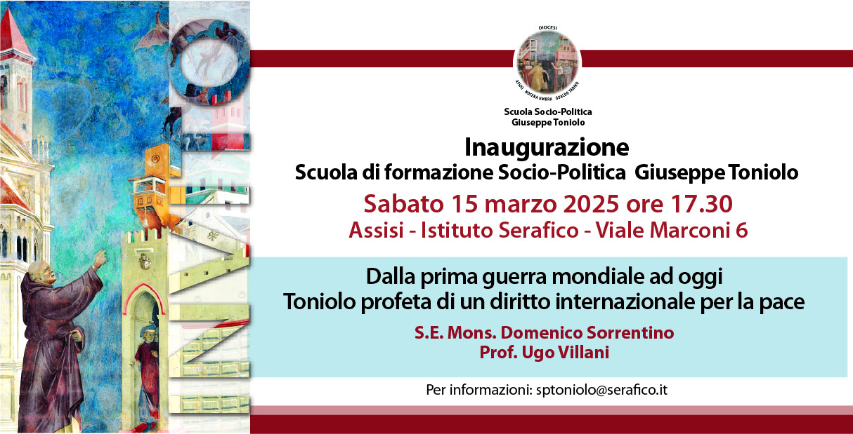 Toniolo profeta di un diritto internazionale per la pace”. Mercoledì 26 marzo ore 19.00, Il ruolo della diplomazia al servizio della pace, S.E. Mons. Petar Rajic e Pasquale Ferrara – Mercoledì 9 aprile ore 19.00, Il mondo smontato, Riccardo Sessa – Martedì 29 aprile ore 19.00, Quale Europa per un mondo che cambia, Fabio Raspadori, Martedì 6 maggio ore 19.00, Come raccontare la Terza guerra mondiale a pezzi, Lucia Capuzzi, Fabio Carminati- Mercoledì 21 maggio ore 19.00 – Geopolitica digitale. La competizione globale per il controllo della Rete Antonio Deruda. Sono previsti altri importanti incontri che verranno annunciati a breve. Per iscrizioni si può scaricare il modulo sul sito della diocesi (https://www.diocesiassisi.it/scuola-socio-politica/) e inviarlo all’indirizzo email: sptoniolo@serafico.it