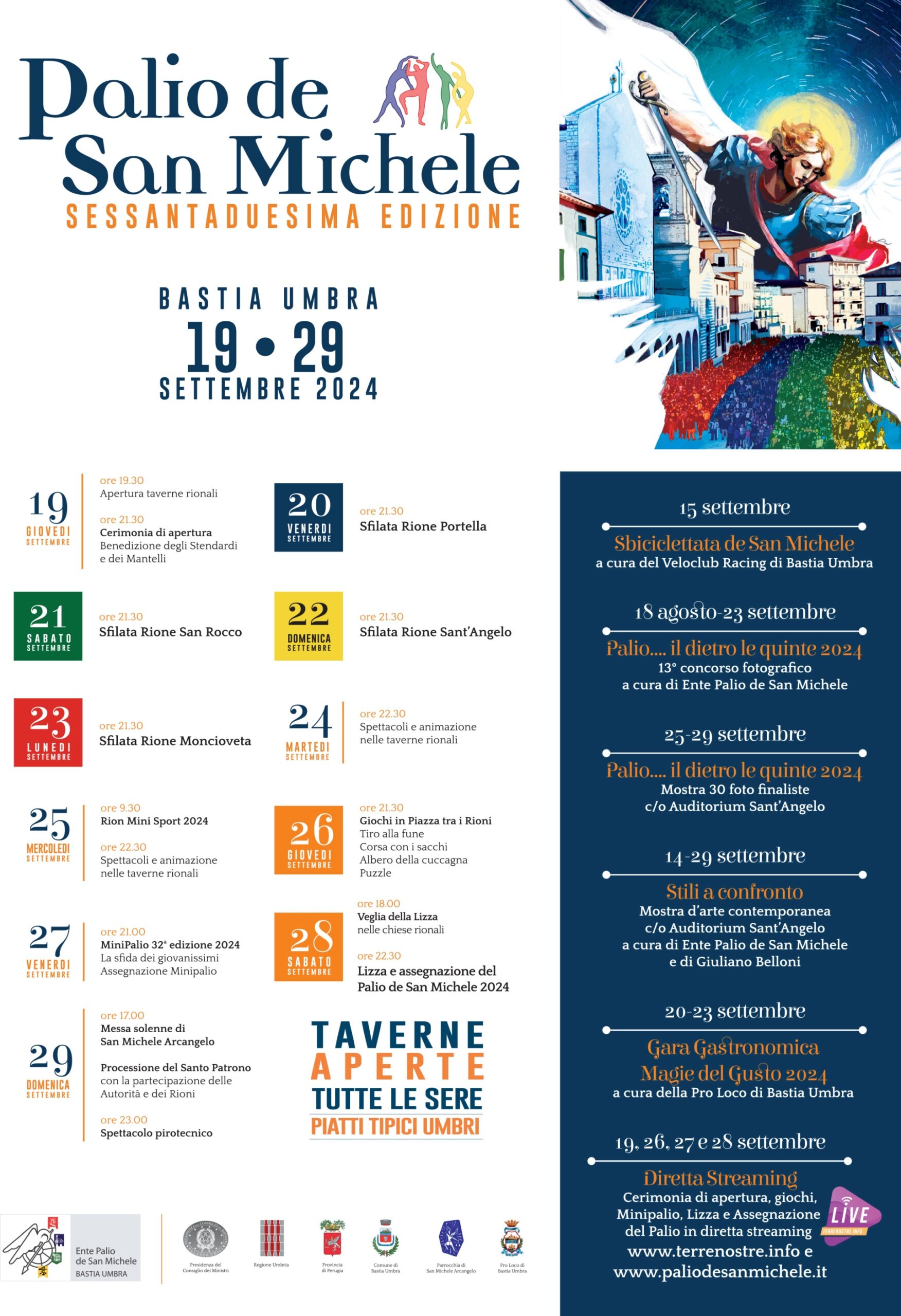 Grande attesa a Bastia per la 62a Edizione del Palio de San Michele che prenderà ufficialmente il via giovedì 19 settembre con l’apertura delle taverne enogastronomiche rionali, dove sarà possibile degustare i piatti tipici della cucina umbra, e, soprattutto, con la Cerimonia d’inaugurazione della 62a edizione con la benedizione degli stendardi e dei mantelli. Verrà inoltre presentato il Palio 2024 realizzato dall’artista napoletana Lucia Fiore e il Minipalio 2024 disegnato da Lorenzo Zampa, alunno della 2a C della Scuola secondaria di I° grado “Colomba Antonietti” di Bastia Umbra. L’intera cerimonia verrà trasmessa in diretta streaming su www.terrenostre.info e su www.paliodesanmichele.it.