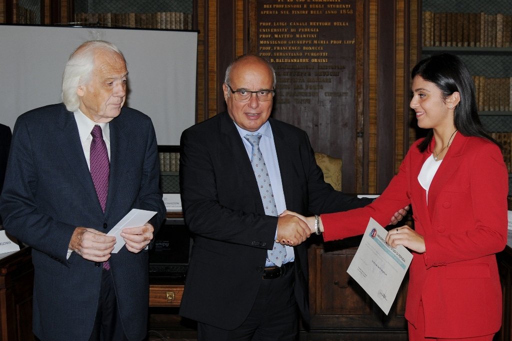 Il Pro-Rettore Vicario, Prof. Fausto Elisei, ha consegnato oggi alla Dott.ssa Ilaria Segoloni, laureata Magistrale in Economia e Management Internazionale, il premio promosso dall’Associazione “Alberto Mezzasoma” e riservato a figlie e figli di dipendenti o di ex-dipendenti dell’Ateneo perugino che si siano laureati in uno dei Dipartimenti dell’Università degli Studi di Perugia.