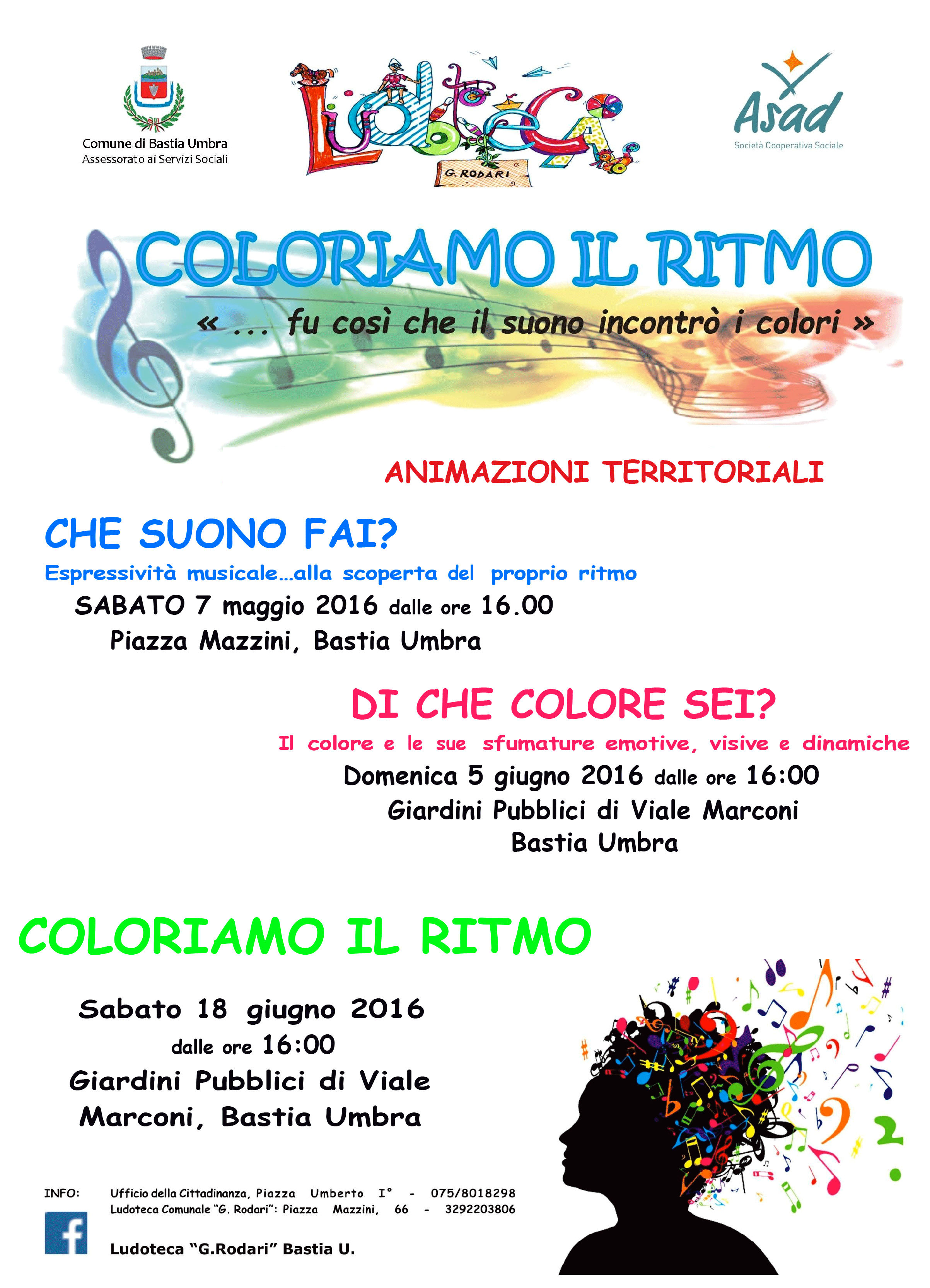 La prima animazione “Che suono fai?”, in programma sabato 7 maggio, è ispirata all’espressività musicale e alla scoperta del proprio ritmo personale, e si terrà in Piazza Mazzini a appetire dalle ore 16. Le altre due iniziative avranno luogo entrambe nei giardini pubblici di Viale Marconi. Domenica 5 giugno, alle 16, l’animazione “Di che colore sei?” sarà ispirata alle varie sfumature visive, dinamiche ed emotive del colore. L’appuntamento finale, sabato 18 giugno, ore 16, “Coloriamo il ritmo” coniugherà due tematiche, il colore e il suono, tramite attività espressive e ludiche realizzate dai bambini.
