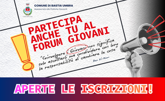 Bastia Umbra, 18/11/2025 – Il Comune di Bastia Umbra informa che sono ufficialmente aperte le adesioni per partecipare al Forum Giovani, lo spazio di partecipazione rivolto alle ragazze e ai ragazzi del territorio, istituito con Delibera del Consiglio Comunale n. 19 del 04/04/2025.