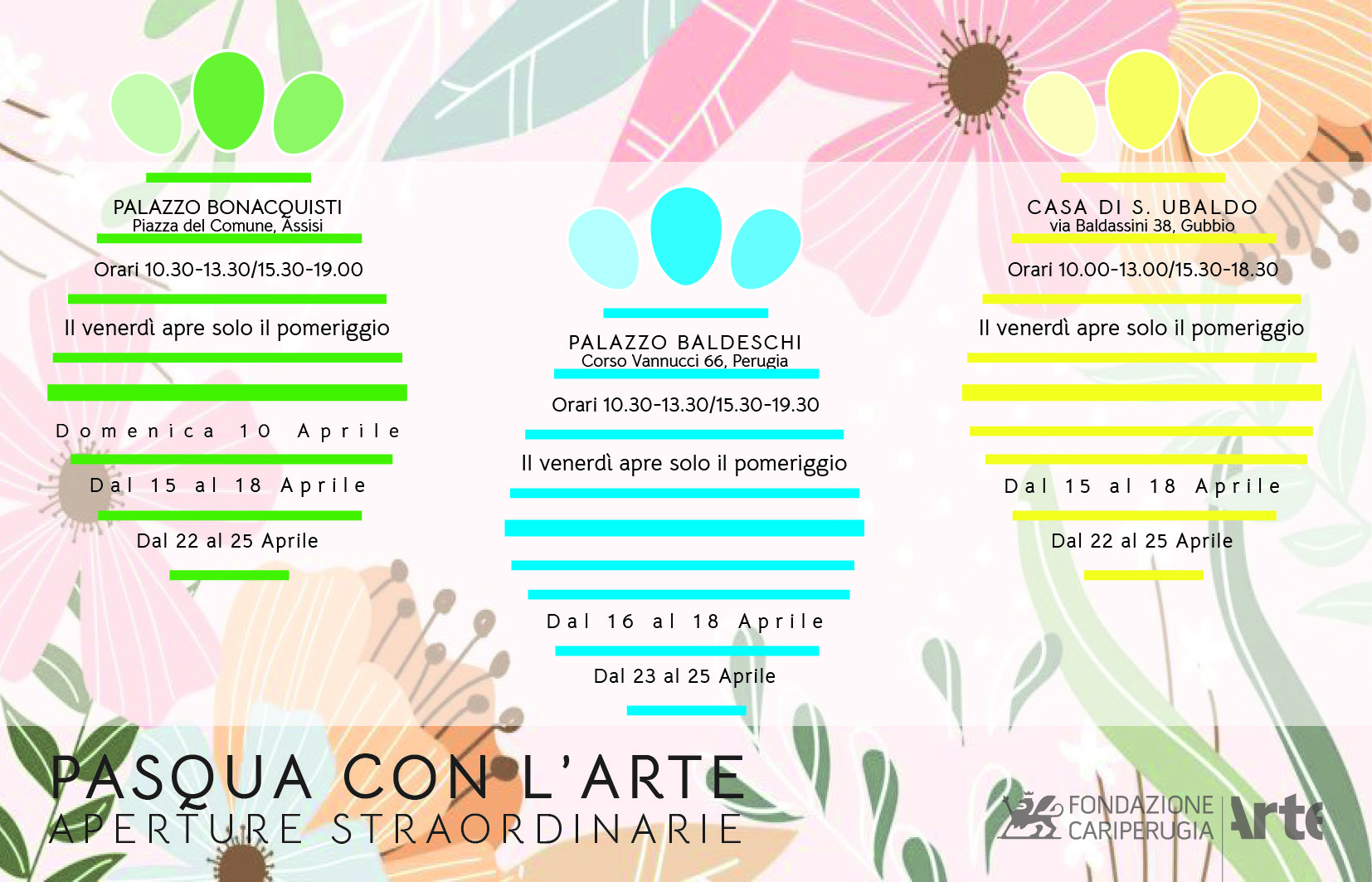 Perugia, 12 aprile 2022 – Dopo due anni di pandemia la Fondazione CariPerugia Arte è di nuovo pronta ad accogliere cittadini e turisti con aperture straordinarie dei suoi musei e visite guidate a tema in occasione delle festività pasquali e del ponte del 25 aprile, nel rispetto delle nuove norme anti-covid che hanno eliminato l’obbligo del green pass per accedere ai musei, pur mantenendo obbligatorio l’uso della mascherina.