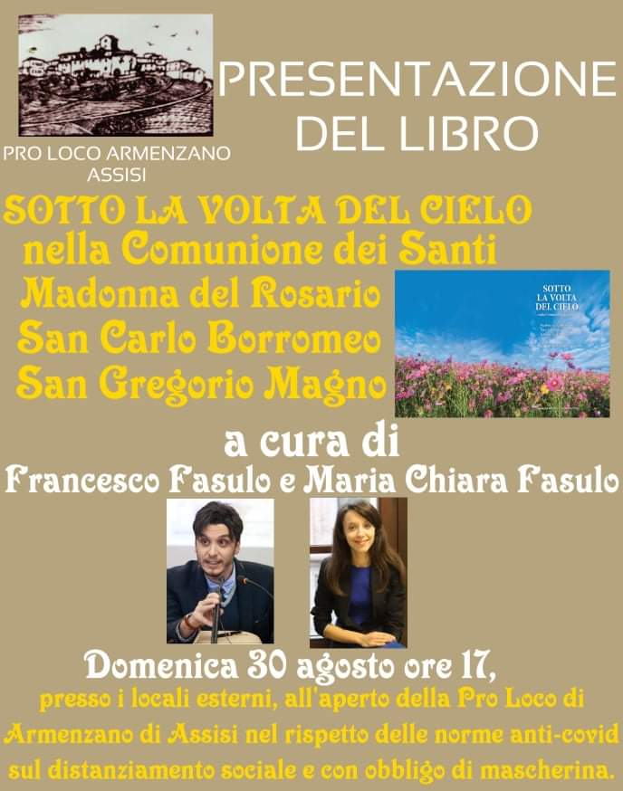Domenica 30 agosto alle ore 17:00 presso la Pro Loco di Armenzano di Assisi, si svolgerà la presentazione del libro “SOTTO LA VOLTA DEL CIELO nella Comunione dei Santi – Madonna del Rosario, San Carlo Borromeo, San Gregorio Magno”, a cura di Francesco Fasulo e Maria Chiara Fasulo. La nostra opera, spiegano i due autori, “tra storia, cultura, arte e spiritualità ha l’obiettivo di sensibilizzare e dare consapevolezza alle persone del nostro territorio comunale assisano su testimoni di vita evangelica come la Madonna del Rosario, San Carlo Borromeo e San Gregorio Magno che hanno vissuto la loro esistenza con amore, misericordia, semplicità, umiltà e attenzione al prossimo.” La Prefazione è stata curata da padre Michele Giura, già parroco di Torchiagina e San Gregorio e l’Introduzione: Il “Patrocinio” dei Santi da padre Luigi Marioli, frate conventuale, critico d’arte e già direttore del Museo del Tesoro della Basilica Papale di San Francesco in Assisi. Lo studio e la ricerca metodica e scrupolosa dei fratelli Fasulo, afferma padre Michele,“ci mette tra le mani altre novità, altra storia cui la comunità di tutto il territorio comunale assisano o di chiunque verrà in possesso di questo pregiato lavoro, potrà attingere o riferirsi.”