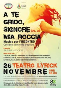 “Il Signore è mia forza e mio scudo, in lui ha confidato il mio cuore. Mi ha dato aiuto: esulta il mio cuore, con il mio canto voglio rendergli grazie”, recita un versetto tratto dal salmo, proprio a suggellare quanto tutta la nostra vita dipenda dalla certezza di un Dio fatto uomo, roccia salda a cui ancorarsi e affidarsi sempre. Questo momento forte di comunione e condivisione in musica, che culminerà con l’adorazione eucaristica, sarà un’occasione per riflettere e per non dimenticare le zone ferite dal terremoto che ha lacerato il centro Italia. Quel Dio che entra nella storia e si nasconde umilmente nel mondo come il lievito in azione nella pasta, si farà carne e sarà volto e voce della band vicentina The Sun, di Debora Vezzani, di fra’ Alessandro Brustenghi, di suor Graciela, di Marco Mammoli, di Giuseppe Bruno (Eight), del Vigno, di Marì e del Corogiovani diocesano. Un caleidoscopio di anime e di cuori che si uniranno ai tanti che vorranno partecipare e donare il loro contributo alla Caritas della diocesi di Spoleto-Norcia (IBAN: IT45M0200821804000104464843). L’ingresso è libero, ma i posti sono limitati ed è necessario iscriversi online dal sito: giovani.diocesiassisi.it.