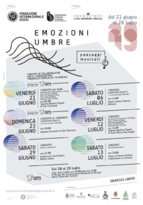 ASSISI, 15 Giugno 2019 – Una serie di concerti tra Assisi, Bastia Umbra, Bettona e Cannara, dal 21 giugno, giorno della Festa della Musica che celebra anche il solstizio d’estate, al 13 luglio, con una ‘coda’ di concerti in Piazza del Comune, durante UniversoAssisi, il festival di musica, architettura, teatro, letteratura e arti performative in scena dal 20 al 28 luglio. È “Emozioni Umbre Paesaggi Musicali”, titolo della prima edizione di questa rassegna voluta dalla Fondazione Internazionale Assisi e dal Conservatorio Morlacchi di Perugia, con il sostegno della Fondazione Cassa di Risparmio di Perugia e con i patrocini della Regione Umbria, insieme alla Città di Assisi e ai Comuni di Bastia Umbra, Bettona e Cannara e alla Camera di Commercio di Perugia.