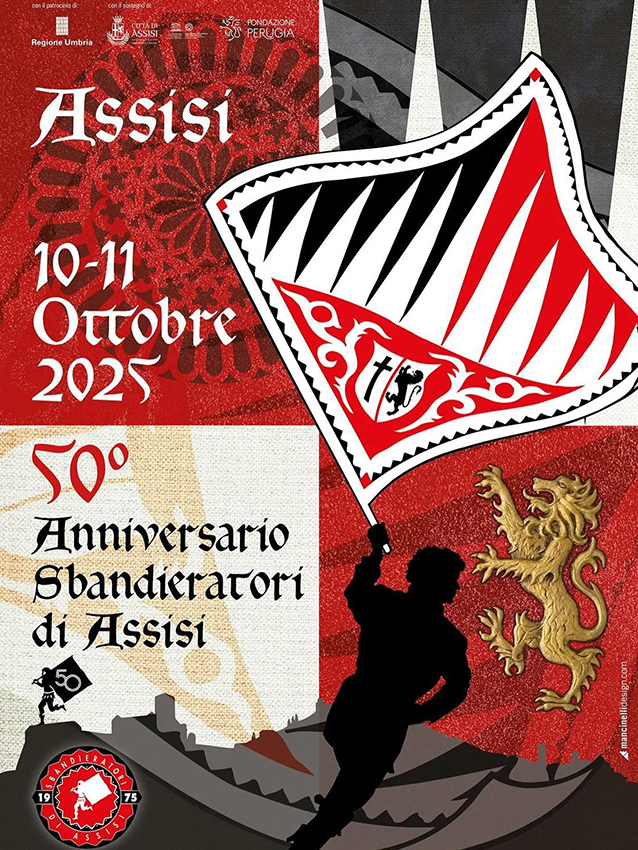 Assisi, 01/10/2025 – L’Associazione Sbandieratori di Assisi è lieta di annunciare la celebrazione del suo 50° anniversario, che avrà luogo in Assisi il 10 e 11 ottobre 2025. Questo importante traguardo sarà festeggiato con una serie di eventi che celebrano la tradizione storica, culturale e artistica legata alla bandiera, coinvolgendo membri storici, cittadini e gruppi ospiti provenienti dalle città di Firenze, Faenza, Gualdo Tadino e Gubbio, realtà che vantano una lunghissima tradizione nel campo delle rievocazioni storiche e delle esibizioni di bandiera.