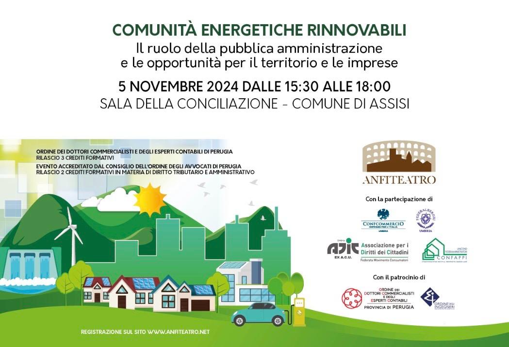 Assisi, 28 ottobre 2024 – Martedì 5 novembre a partire dalla 15.30, presso la Sala della Conciliazione del Palazzo Comunale di Assisi, si terrà l’incontro “Comunità energetiche rinnovabili. Il ruolo della pubblica amministrazione e le opportunità per il territorio e le imprese”, organizzato dall’associazione Anfiteatro.