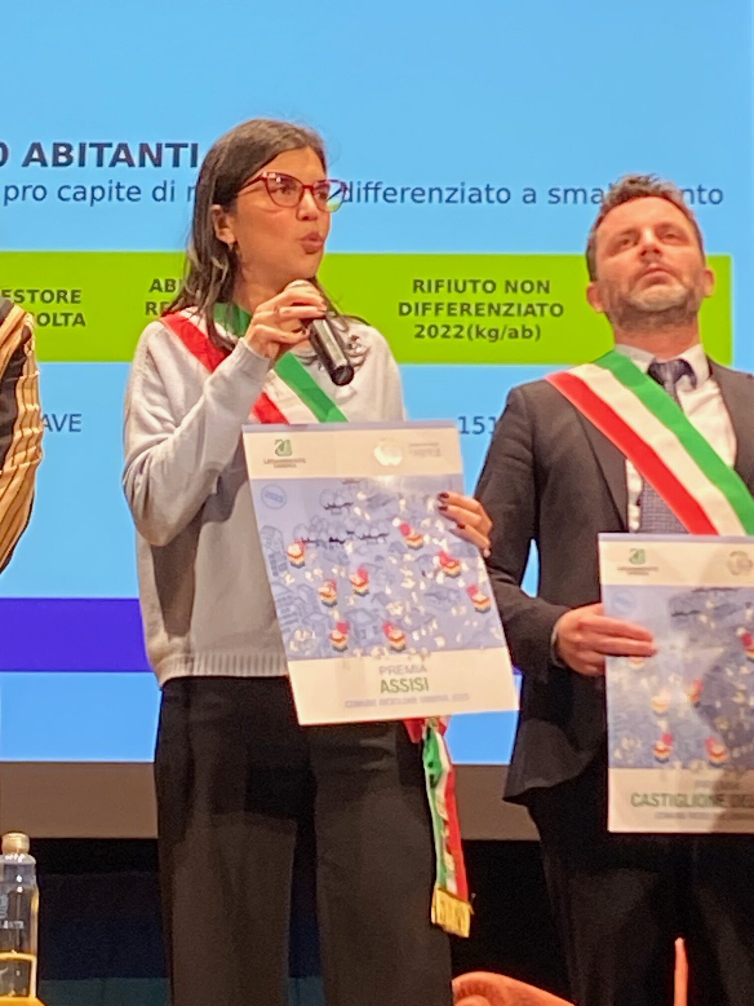 A ricevere il prestigioso riconoscimento è stato l’assessore comunale all’ambiente Veronica Cavallucci. “Per la città di Assisi questo premio – ha detto l’assessore – è motivo di grande orgoglio perché da sempre quest’amministrazione è attenta alle problematiche ambientali ed è di stimolo a fare di più per sensibilizzare la comunità ad aumentare e meglio la raccolta differenziata”.