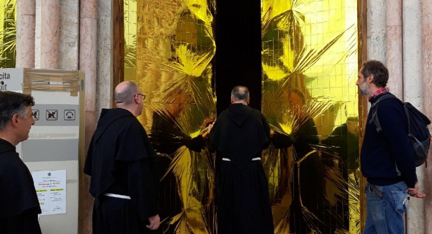 ASSISI (PERUGIA), 26 SET – In occasione della Giornata mondiale del migrante e del rifugiato, anche la comunità dei frati del Sacro Convento di Assisi fa sentire la sua voce sul tema delle migrazioni e dell’accoglienza, aderendo al progetto artistico “Eldorato” di Giovanni de Gara. Nella mattinata di oggi, sabato 26 settembre, l’artista ha installato, sulle porte della Basilica Superiore di San Francesco d’Assisi, oltre 20 metri di coperte termiche. Presenti alla cerimonia, oltre l’artista, anche il Custode del Sacro Convento di Assisi, padre Mauro Gambetti, padre Marco Moroni, e il direttore della Sala Stampa del Sacro Convento di Assisi, padre Enzo Fortunato.