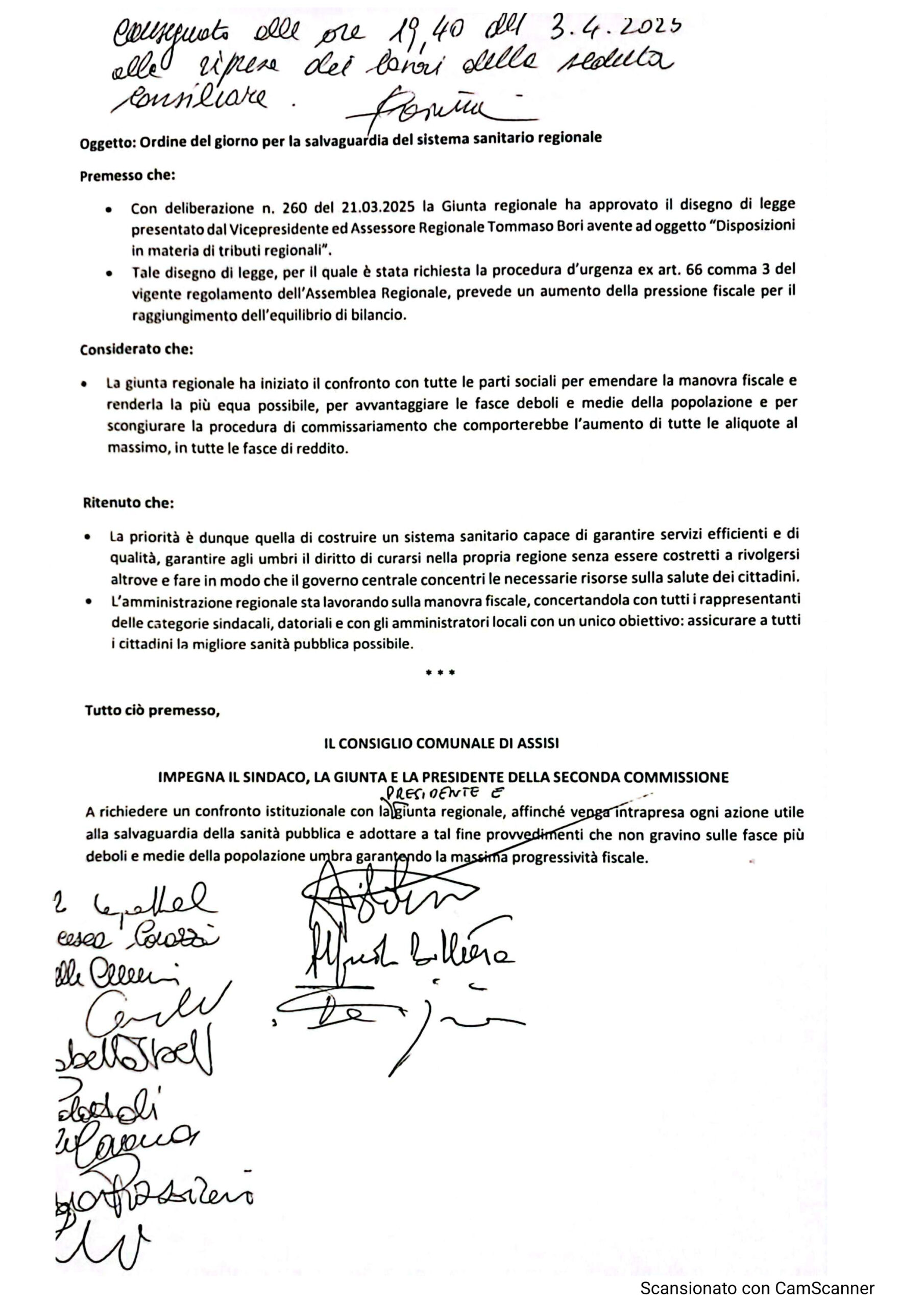 Ma andiamo con ordine: durante la seduta consiliare, al momento della presentazione dell’ordine del giorno, il consigliere Mignani, prima di entrare nel merito dell’argomento, ha chiesto una pausa per rivedere insieme alla maggioranza il documento e trovare un punto d’incontro per presentarne uno che potesse essere firmato da tutti dichiarando esplicitamente che la “richiesta di ritiro” del disegno di legge sarebbe stata ritrattata a favore di una “richiesta di confronto” con la Presidente Proietti. Come maggioranza ci siamo resi immediatamente disponibili a lavorare di concerto ad un documento condiviso (che viene riportato in allegato nella sua forma ufficiale con tanto di firme di tutti i consiglieri presenti) perché riteniamo che un’interlocuzione con la Presidente e la Giunta Regionale, richiesta all’unanimità dal Consiglio Comunale, può avere senza dubbio un impatto più incisivo. Così, dopo una breve pausa, è stato presentato un nuovo documento che, citiamo letteralmente “impegna il Sindaco, la Giunta e la Presidente della seconda commissione a richiedere un confronto istituzionale con la Presidente e la Giunta Regionale affinché venga intrapresa ogni azione utile alla salvaguardia della sanità pubblica e adottare a tal fine provvedimenti che non gravino sulle fasce più deboli e medie della popolazione umbra garantendo la massima progressività fiscale”.  Tutto ciò, sottoscritto dai consiglieri presenti (per la minoranza parliamo di Mignani del Gruppo Misto, Apostolico di Fratelli d’Italia e Cannelli di Assisi Insieme), è stato votato all’unanimità rappresentando a nostro avviso un bellissimo segnale di politica costruttiva che va verso l’interesse dei cittadini piuttosto che la mera speculazione. Perché il comunicato uscito ieri proprio questo è sembrato, mera speculazione politica, soprattutto dopo quanto successo ormai cinque giorni fa in Consiglio Comunale, luogo che rappresenta la massima espressione dell’amministrazione pubblica locale, per chi se lo fosse dimenticato. Inoltre, nella giornata di ieri, la presidente della seconda commissione consiliare Laura Pizziconi, ha prontamente convocato una commissione straordinaria (come richiesto nell’ordine del giorno) alla presenza della Presidente Regionale Proietti per discutere insieme a tutto il Consiglio del delicato tema (commissione che si svolge oggi pomeriggio 8 aprile).