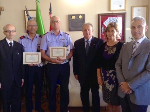 Assisi, 16 settembre 2014: il Sindaco Claudio Ricci ha premiato, ieri mattina (presenti l’Assessore Lucio Cannelli e il comandante dei vigili urbani Antonio Gentili) i Vigili Corrado Mazzoni e Maurizio Balducci che, durante una recente eccezionale pioggia, hanno salvato una persona bloccata in un sottopasso stradale allagato.