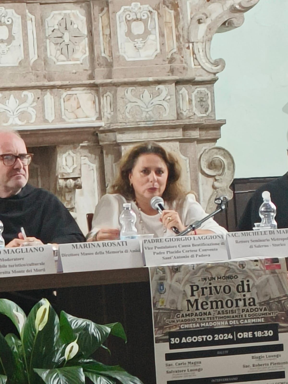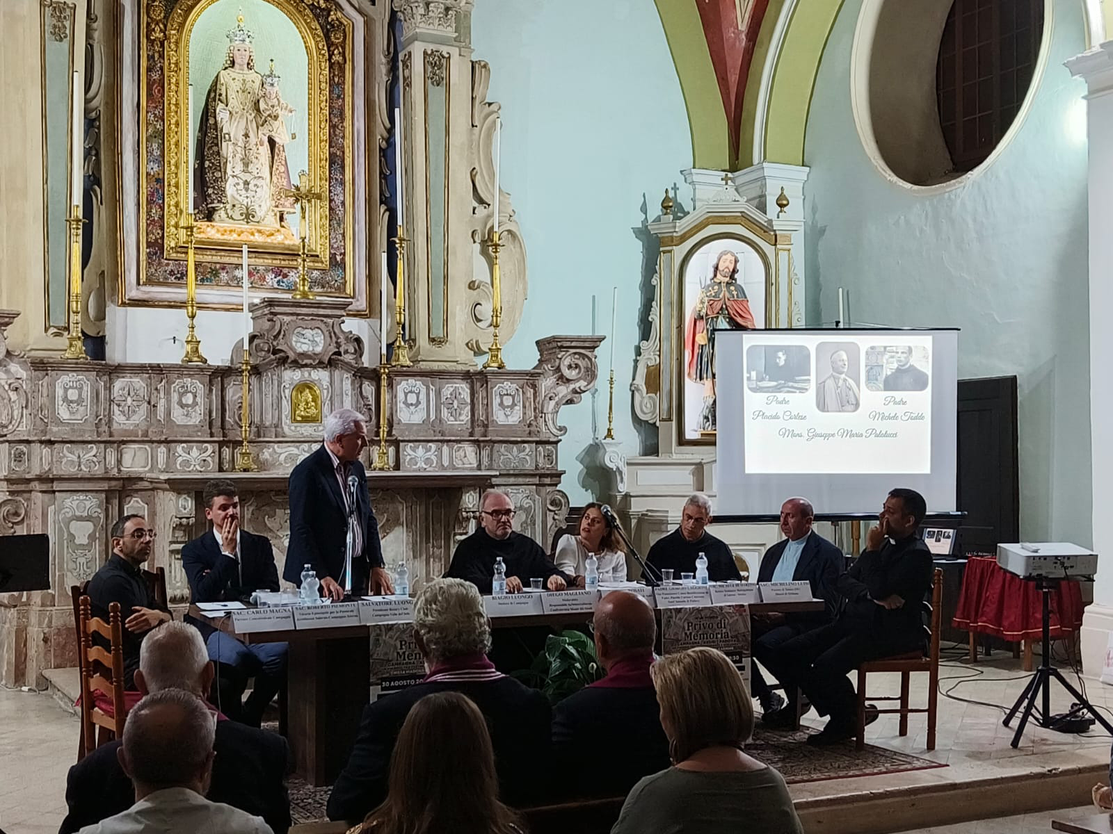 ASSISI – Il vescovo Giuseppe Maria Palatucci, il nipote Giovanni, il francescano padre Placido Cortese, il vescovo di Assisi, monsignor Giuseppe Placido Nicolini con il frate del Sacro convento padre Michele Todde, insieme ad altri, sono solo alcuni, tra ecclesiastici e religiosi che, nel periodo della persecuzione razziale, sono stati artefici di un’azione di accoglienza e salvataggio degli ebrei. Di questo si è parlato, nel pomeriggio di venerdì 30 agosto nel corso di un convegno dal titolo: “Un mondo senza memoria” che si è svolto nella chiesa della Madonna del Carmine, a Campagna, luogo dove fu allestito uno dei più importanti campi di internamento degli ebrei e dove operò il vescovo francescano Palatucci, in stretta collaborazione con il nipote, questore reggente a Fiume. A mettere in evidenza il ruolo della chiesa è stata Marina Rosati, direttrice del Museo della Memoria di Assisi, 1943-1944 che ha posto l’attenzione sia sulla straordinaria pagina di accoglienza e fraternità perpetrata nella città del Poverello ad opera di una rete clandestina che faceva capo al vescovo Nicolini, sia su altre situazioni e luoghi dove l’operato della chiesa è stato unico e provvidenziale. Don Michele Di Martino, rettore del seminario metropolitano di Salerno-Storico, si è soffermato sugli “ebrei di Campagna: attraverso l’archivio di monsignor Palatucci”. Dai documenti e dalle testimonianze, molte delle quali raccolte e ben esposte al Museo della memoria e della pace di Campagna, dove viene raccontata in maniera puntuale e con accorgimenti tecnologici e visivi di ottimo livello, la vita del campo di internamento e l’opera portata avanti dai Palatucci, emerge con evidenza quanto fu importante anche qui il ruolo della chiesa e comunque di tutta la città campana. Padre Giorgio Laggioni, frate conventuale di Padova e vice postulatore della causa di beatificazione di padre Cortese, ha raccontato tutto l’operato di questo francescano, brutalmente torturato e ucciso dai nazisti, mentre don Michelino Luisi, parroco di Tonara, città originaria di padre Todde, si è soffermato sul tema: “Umanità in gioco, con una chiesa in uscita, al tempo di Francesco”. A collegare l’operato dei tre francescani, Palatucci, Todde e Cortese è stato padre Felice Autieri, conventuale e docente di storia della chiesa a Napoli e di storia del francescanesimo in Assisi che ha sottolineato “la credibilità dei tre religiosi che non fecero nessuna retorica o spiritualismi ma furono pragmatici e concreti”.  “Parlare di Assisi in un contesto dove un altro vescovo benemerito ha fatto tanto per gli ebrei – ha sottolineato Rosati – è stato davvero interessante e di apertura per un percorso nel segno dell’accoglienza e della fraternità. Con il Museo di Campagna, straordinariamente bello, interessante e ben curato grazie anche alle ricerche di Michele Aiello e alla direzione di Marcello Naimoli, abbiamo intenzione di avviare delle collaborazioni e un progetto di ricostruzione della memoria che metta in rete i luoghi con storie simili come queste e dove l’operato della Chiesa è stato risolutivo, anche perché, ci sono documenti che ci fanno pensare a spostamenti e sinergie da una Curia all’altra”.
