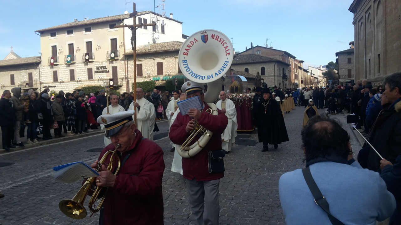 Perugia, 16 gennaio ’17 – E’ stato Varenne, star del palcoscenico ippico mondiale, ad aprire il lungo corteo che, in occasione della celebrazione della festa di Sant’Antonio. La statua del Santo e le sue reliquie sono state portate in corteo in una Santa Maria degli Angeli stracolma di gente. Questa manifestazione coinvolge tutta la comunità angelana, e non solo, erano tantissime le famiglie che per la benedizione degli animali sono arrivati accompagnati da cani, gatti e pesciloli. Una tradizione amatissima quella del Piatto di Sant’Antonio che ogni anno si rinnova grazie all’impegno dei Priori Serventi. Dopo la processione e la benedizione degli animali la festa è proseguita all’interno dei Ristoranti Serventi 2017. Oltre una trentina le attività ricettive fra le migliori del territorio, hanno servito il Piatto di Sant’Antonio Abate (rigatoni al sugo di carne, salsicce arrosto, polpette in umido, carne di manzo al forno, pane, acqua, vino, mele e arance) a centinaia di persone.