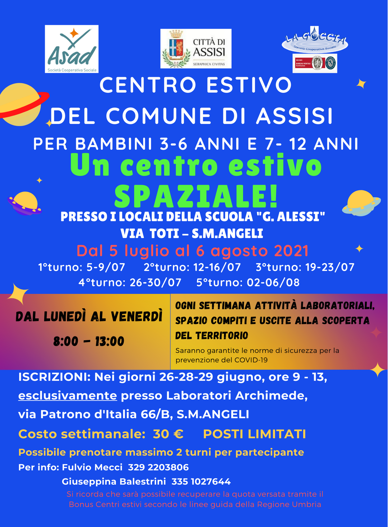 “L’amministrazione comunale ancora una volta, con la scelta di organizzare i centri estivi, vuole testimoniare la vicinanza concreta alle famiglie di Assisi – ha detto l’assessore ai servizi socio-sanitari Massimo Paggi – e pensare soprattutto ai più piccoli che sono stati per troppo tempo privati della socialità. I centri estivi sono l’occasione giusta per favorire l’incontro in una modalità educativa perché saranno molte le attività formative che si svolgeranno durante la settimana. Il contributo economico che abbiamo stanziato per tale finalità è in coerenza con la politica dell’amministrazione sempre attenta alle esigenze delle famiglie del territorio”.