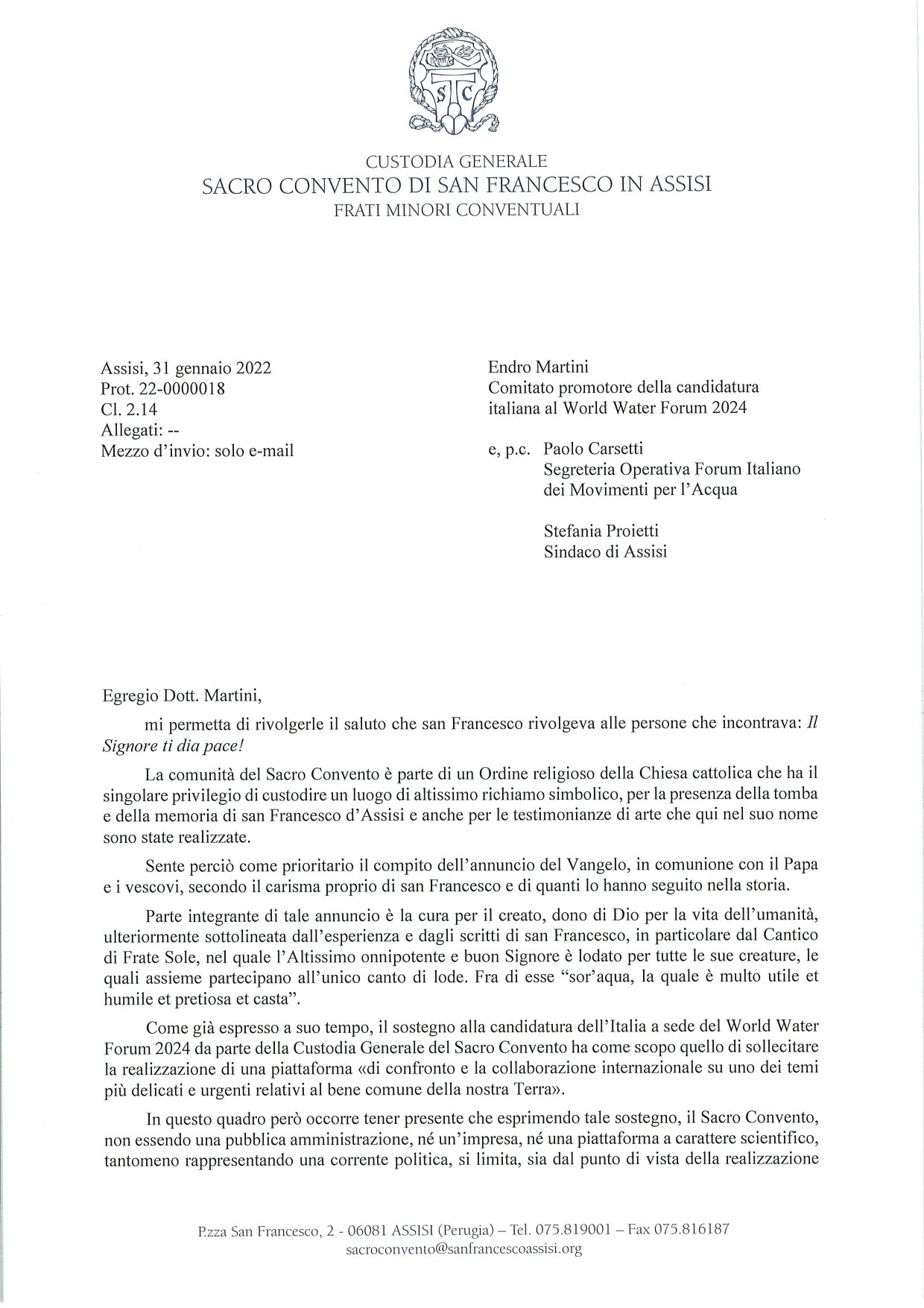 In riferimento a quanto pubblicato dalla stampa odierna sulla candidatura della città di Assisi ad ospitare il World Water Forum 2024, per maggiore chiarezza rendiamo pubblica la lettera inviata dal Custode del Sacro Convento di Assisi, fra Marco Moroni, nel mese di gennaio al Comitato promotore della candidatura italiana al World Water Forum. La lettera è stata scritta dopo un ampio confronto con le diverse realtà e in piena sintonia con la posizione del Comune di Assisi.