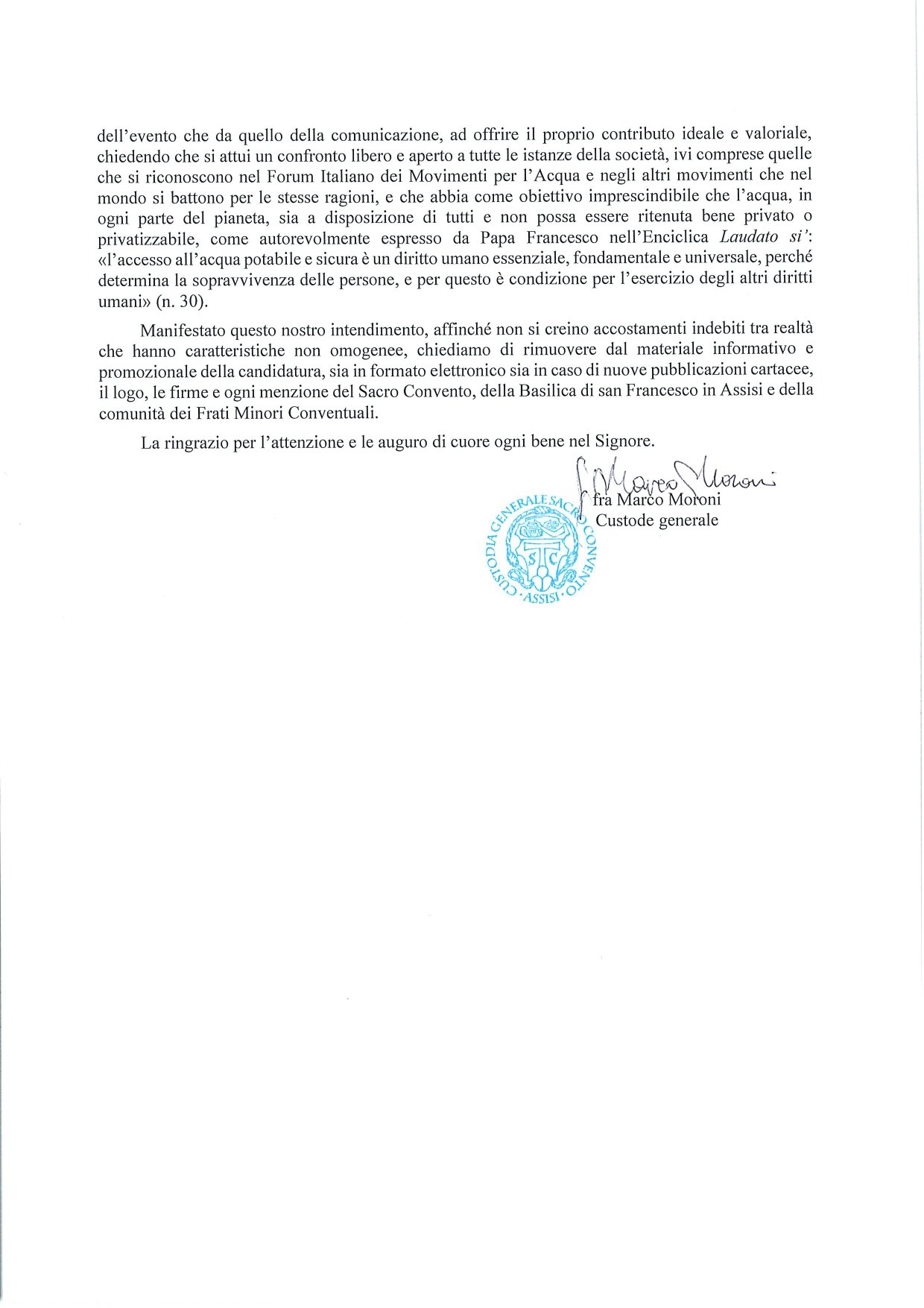 Il Custode del Sacro Convento ha anche sottolineato come sia necessario «tener presente che esprimendo tale sostegno, il Sacro Convento, non essendo una pubblica amministrazione, né un’impresa, né una piattaforma a carattere scientifico e non rappresentando tantomeno una corrente politica, si limita, sia dal punto di vista della realizzazione dell’evento che da quello della comunicazione, ad offrire il proprio contributo ideale e valoriale non organizzativo. Chiediamo – continua fra Marco Moroni – che si attui un confronto libero e aperto a tutte le istanze della società, ivi comprese quelle che si riconoscono nel Forum Italiano dei Movimenti per l’Acqua e negli altri movimenti che nel mondo si battono per le stesse ragioni, e che abbia come obiettivo imprescindibile che l’acqua, in ogni parte del pianeta, sia a disposizione di tutti e non possa essere ritenuta bene privato o privatizzabile, come autorevolmente espresso da Papa Francesco nell’Enciclica Laudato si’: “l’accesso all’acqua potabile e sicura è un diritto umano essenziale, fondamentale e universale, perché determina la sopravvivenza delle persone, e per questo è condizione per l’esercizio degli altri diritti umani” (n. 30). Auspichiamo altresì un accordo globale vincolante sotto l’egida delle Nazioni Unite sull’acqua pubblica».