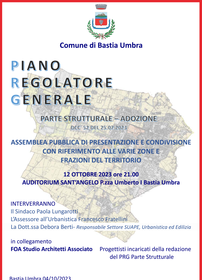 12 ottobre alle ore 21.00 presso l’Auditorium Sant’Angelo in Piazza Umberto I Proseguono le assemblee pubbliche di presentazione e condivisione del nuovo PRG Parte Strutturale, adottato dal Consiglio Comunale durante la seduta del 25/07/2023 con proprio atto n. 52, il 13 Settembre 2023. L’incontro aperto alla cittadinanza con attenzione particolare a zone e frazioni si svolgerà il 12 ottobre alle …