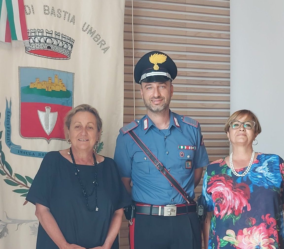 Il Sindaco Paola Lungarotti dà il benvenuto al neo – Comandante della locale Stazione dei Carabinieri, Maresciallo Capo Claudio Parafioriti e ringrazia il predecessore Gennaro Colella.
