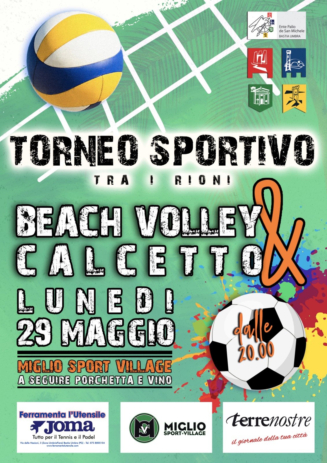 Lunedì 29 Maggio 2023 dalle ore 20.00 Sponsor Tecnici: Miglio Sport Village Partner: Terrenostre, Ferramenta L’Utensile Lunedì 29 maggio prenderà il via l’edizione 2023 del Torneo di Beach Volley femminile & Calcetto maschile tra i Rioni del Palio de San Michele di Bastia Umbra. La precedente edizione del torneo di calcetto è stata vinta dal Rione Portella che ha sconfitto in finale il rione Moncioveta …