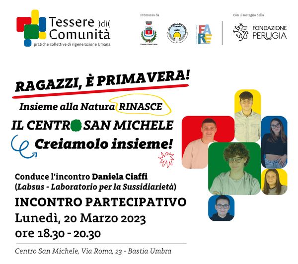 TESSERE per continuare a creare insieme il nuovo Centro San Michele, uno spazio tutto per i giovani con le vostre idee, la vostra immaginazione e i vostri desideri! La cittadinanza è invitata a partecipare Lunedì 20 marzo dalle 18.30 alle 20.30 al Centro San Michele, Via Roma 23, Bastia Umbra. Verranno sviluppate insieme a tutta la comunità azioni e progetti …