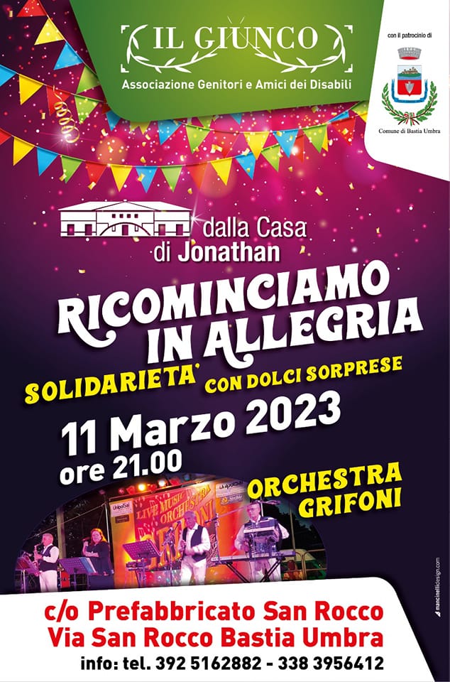 “Ricominciamo in allegria, solidarietà con dolci sorprese” è il titolo della serata di Musica e solidarietà organizzata da La Casa di Jonathan – Il Giunco, Ass. Genitori e Amici dei disabili si terrà Sabato 11 Marzo 2023 ore 21.00 con l’Orchestra Grifoni presso il prefabbricato San Rocco in Via San Rocco a Bastia Umbra Per info 392 5162882- 3383956412 …