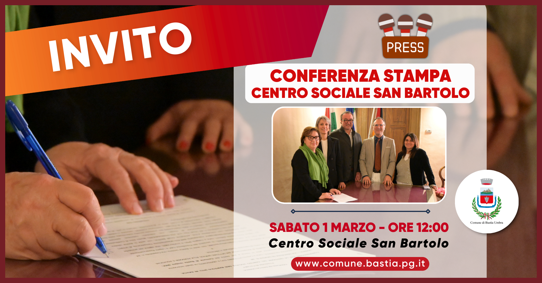COMUNICATO STAMPA CONFERENZA STAMPA – CENTRO SOCIALE SAN BARTOLO: AL VIA UN NUOVO MODELLO DI AGGREGAZIONE SOCIALE PER BASTIA Bastia Umbra, 28/02/2025 – L’Amministrazione Comunale è lieta di invitare tutti i cittadini domani, Sabato 1 Marzo alle ore 12:00, presso il Centro Sociale di San Bartolo (Bastiola), per la Conferenza Stampa di Presentazione di un nuovo modello di aggregazione …